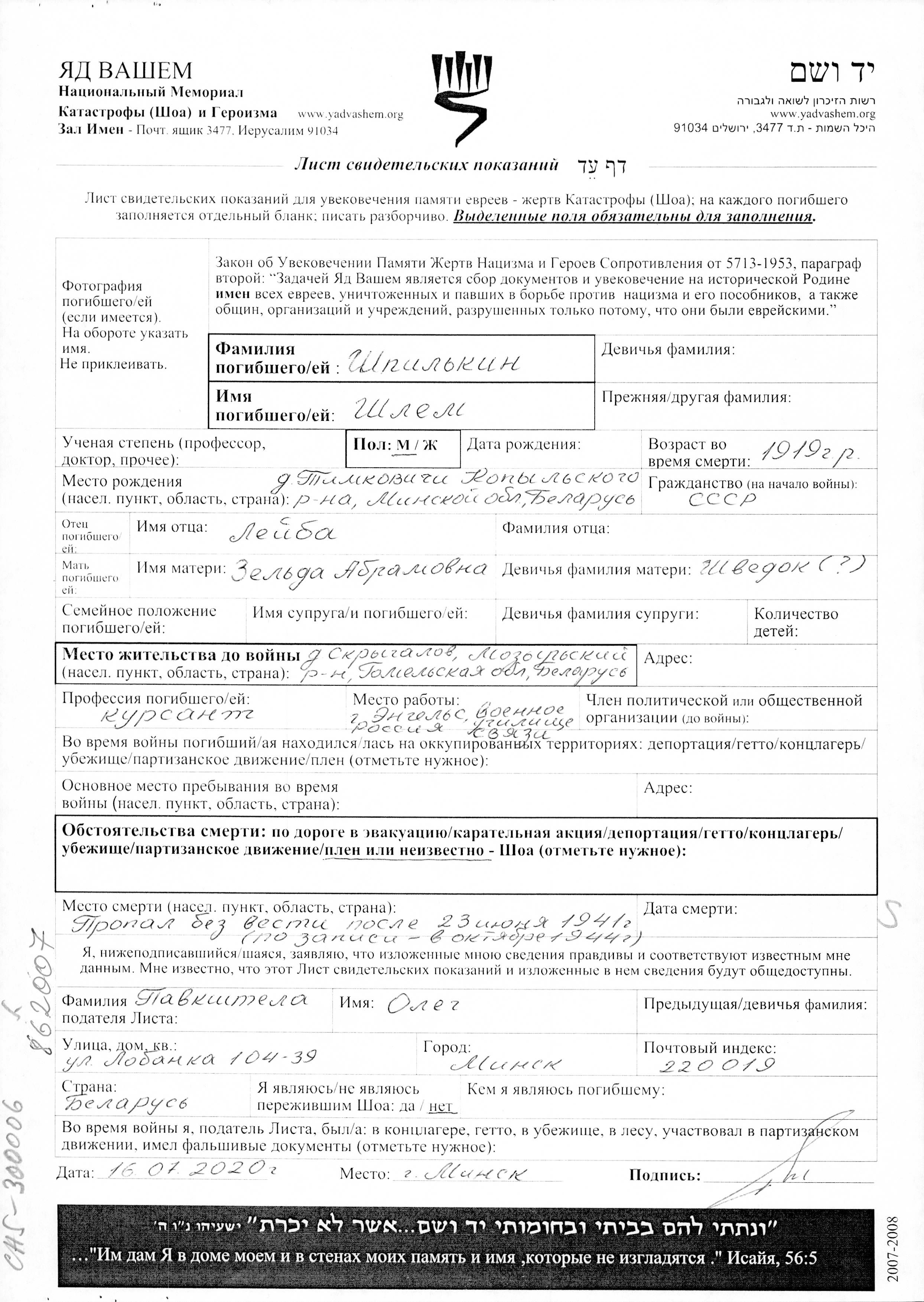 Shlem Shpilkin nació en Timkovichi, Bielorrusia (URSS) en 1919. Era Kursant voyennogo uchilishcha svyazi russian. Antes de la segunda guerra mundial vivía en Engels, Rusia (URSS). Shlem fue asesinado durante la Shoá. Lugar de la muerte: lugar desconocido en 23/06/1941.