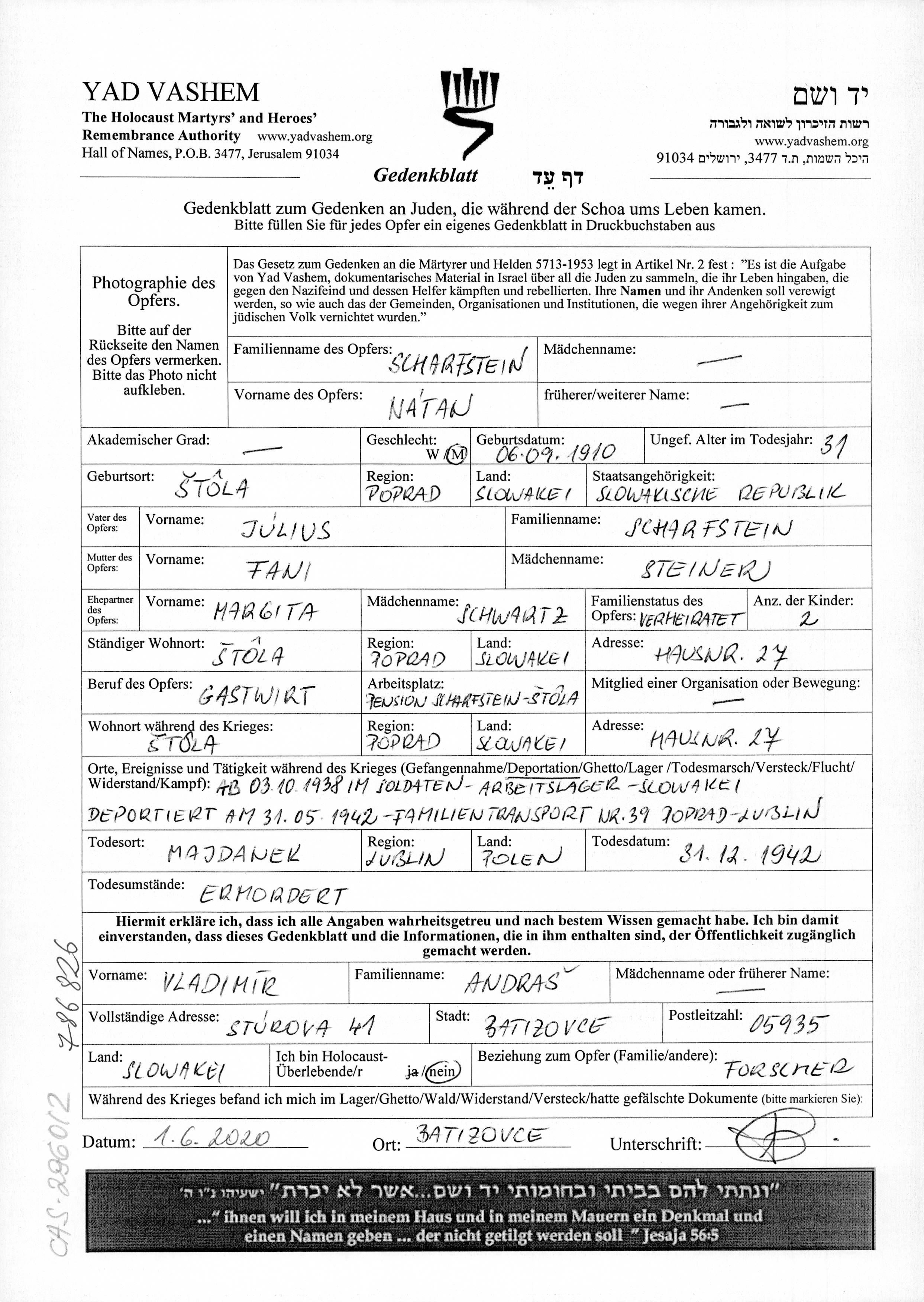 Scharfstein Natan 1910 Stola, Checoslovaquia Hoja de Testimonio
