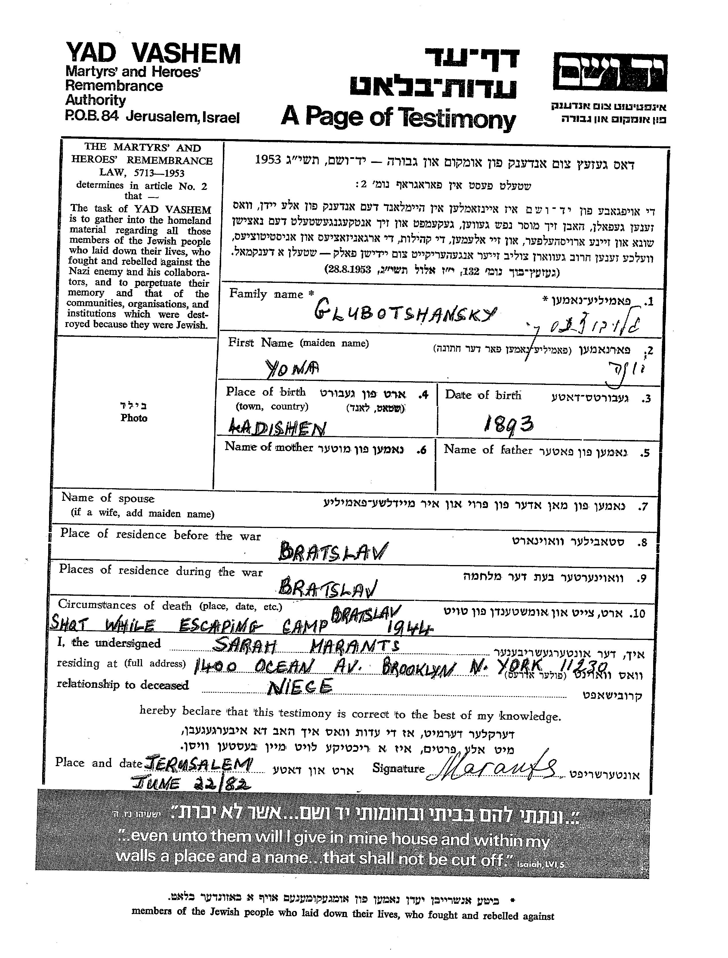 Glubotshansky Yona 1893 Bratslav, Ucrania (URSS) Hoja de Testimonio