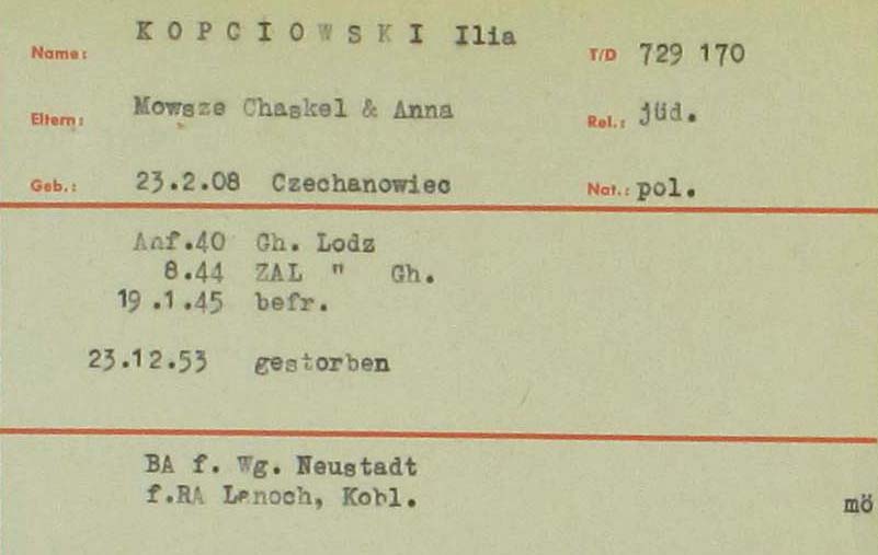 | Kopciowski | Ilja | 1908 | Lodz, Polonia | lista de prisioneros en el gheto de Lodz |