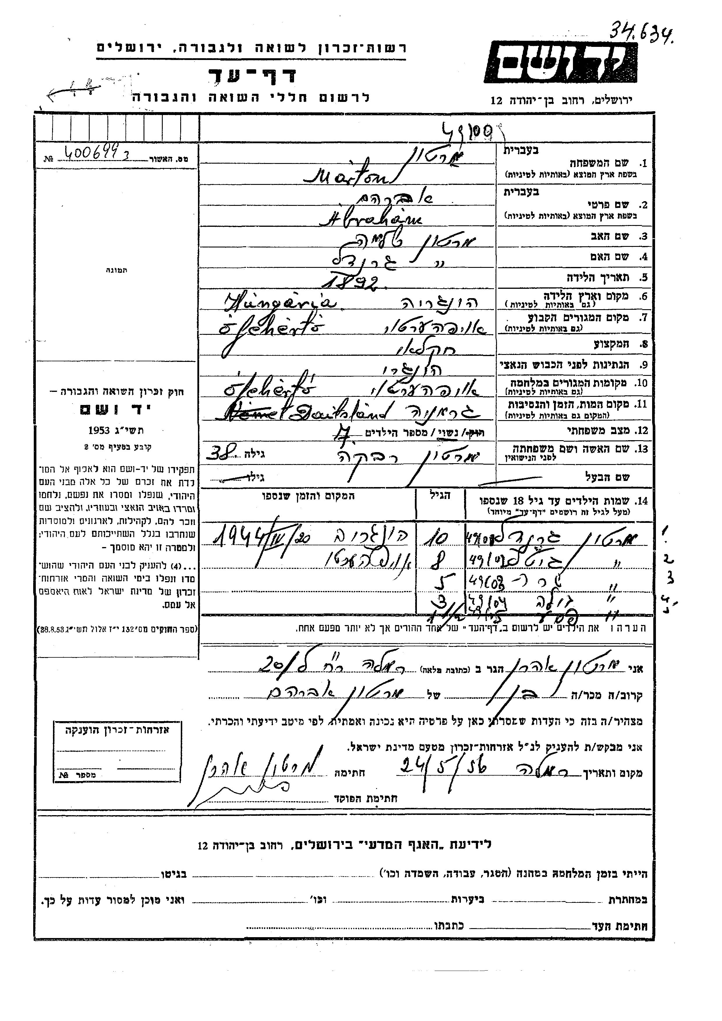 Yad Vashem - Colección conmemorativa de Hojas de Testimonio