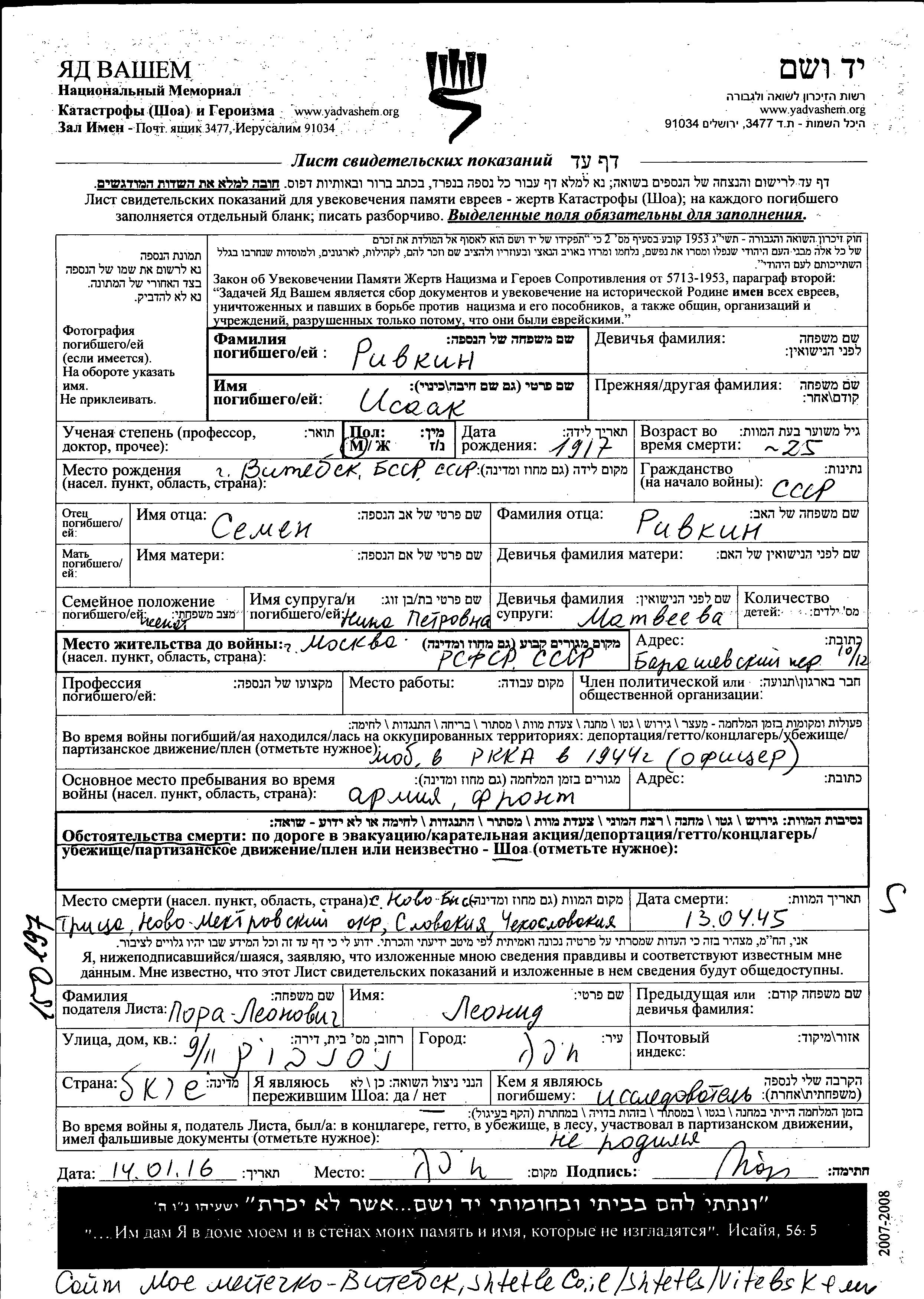 Isaak Ryvkin nació en Vitebsk, Bielorrusia (URSS) en 1917. Era Geólogo. Antes de la segunda guerra mundial vivía en Moskva, Rusia (URSS). Isaak murió en servicio militar. Lugar de la muerte: Undeciphered Place en 13/04/1945.