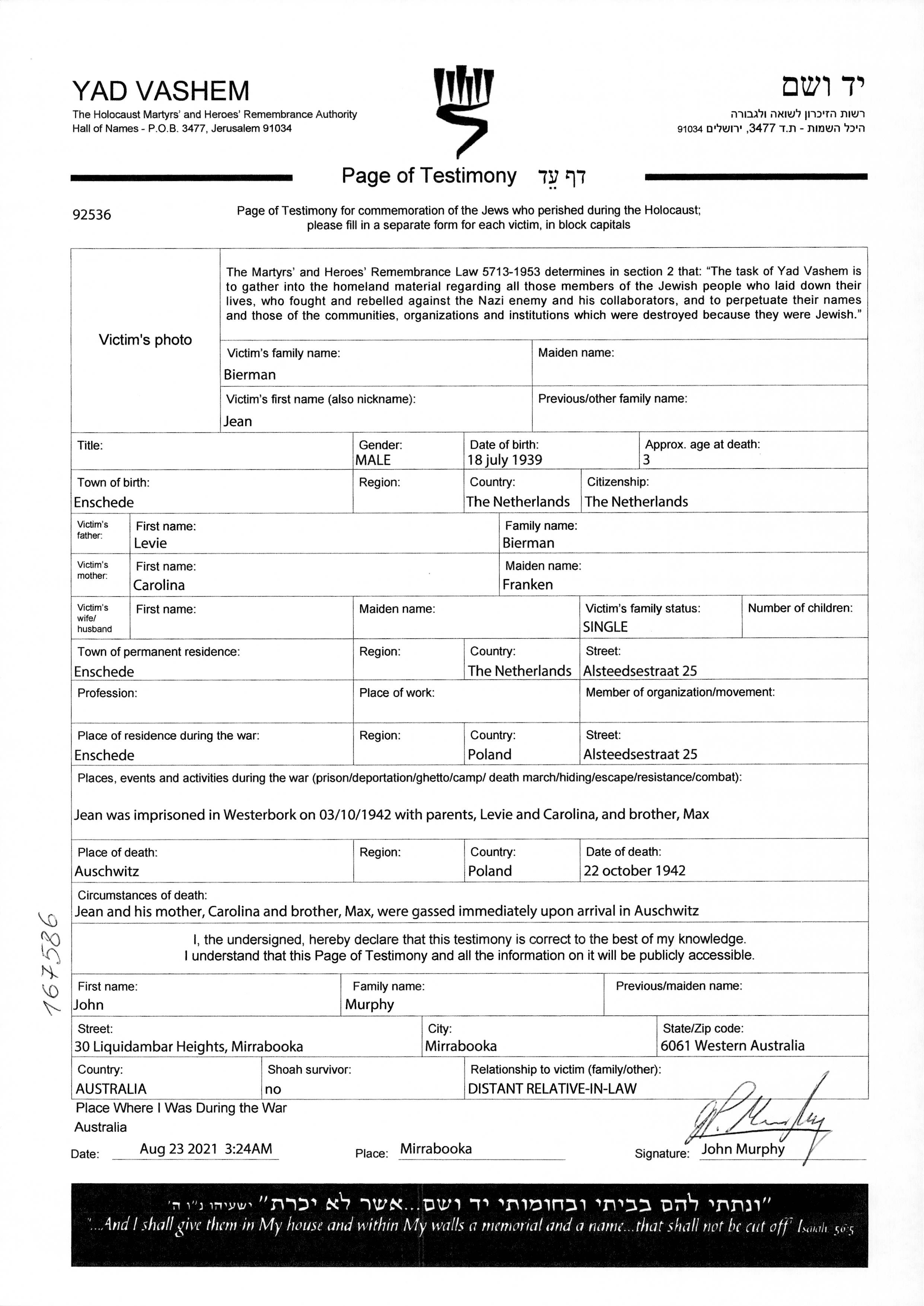 | Bierman | Jean | 1939 | Enschede, Holanda | Hoja de Testimonio (digital firmada) |