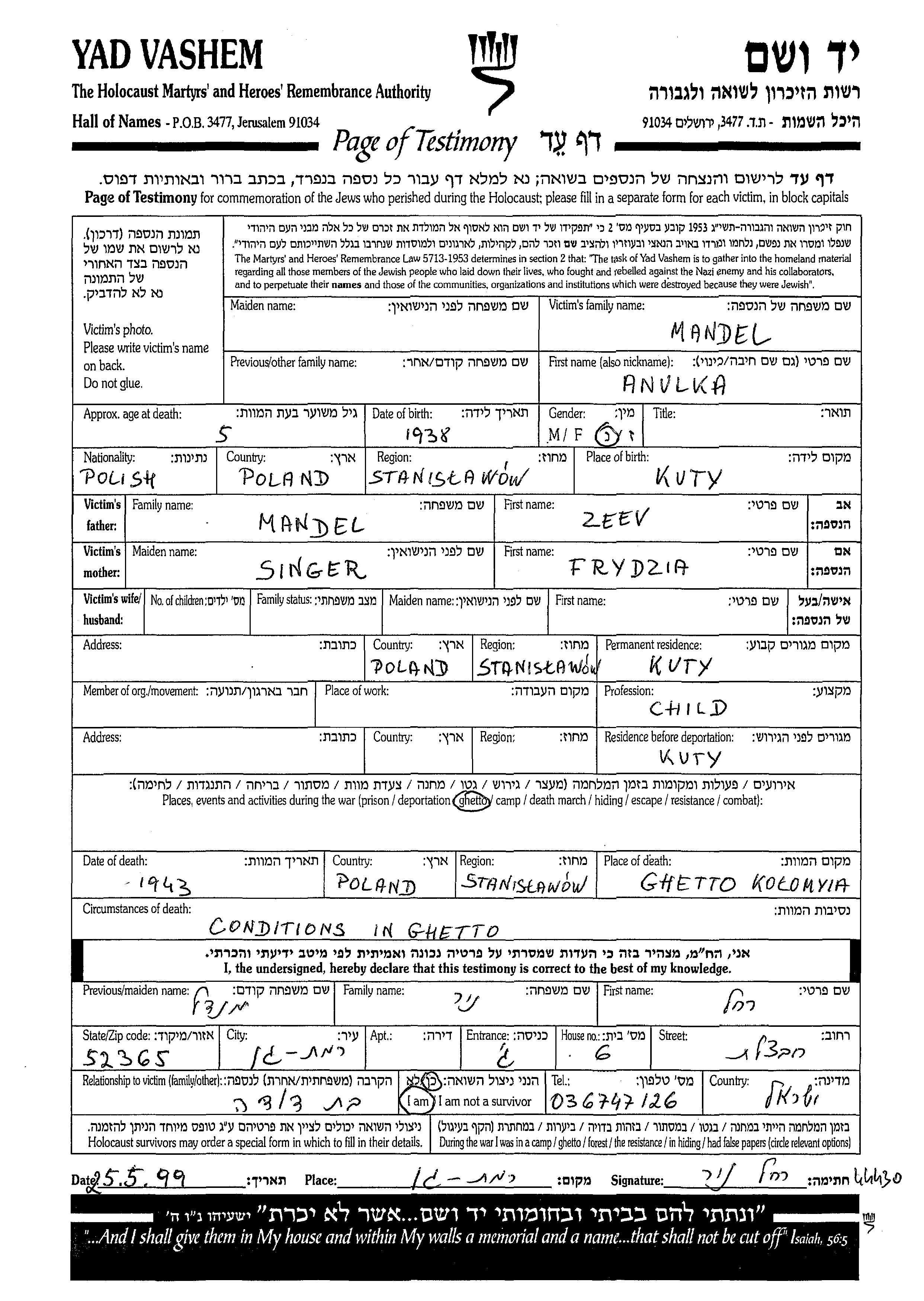 Mandel Anulka 1938 Kuty, Polonia Hoja de Testimonio