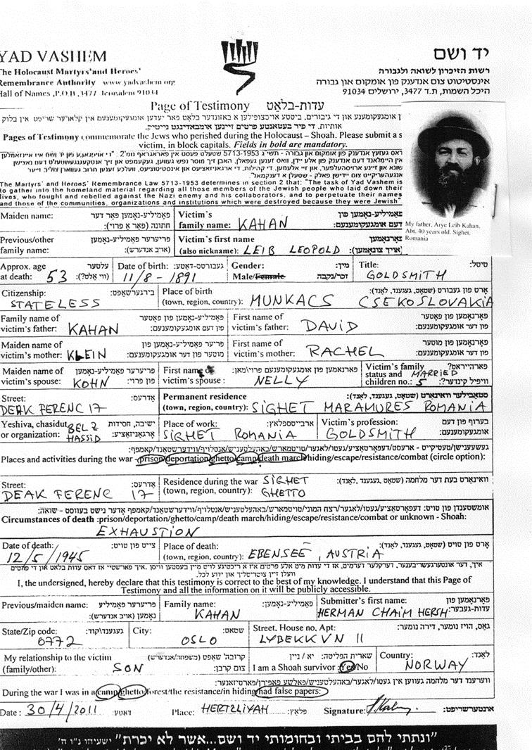 Leib Leopold Kahan nació en Munkacs, Checoslovaquia en 1891. Era Orfebre. Antes de la segunda guerra mundial vivía en Sighet, Rumania. Leib Leopold fue asesinado durante la Shoá. Lugar de la muerte: Ebensee, Austria en 12/05/1945.