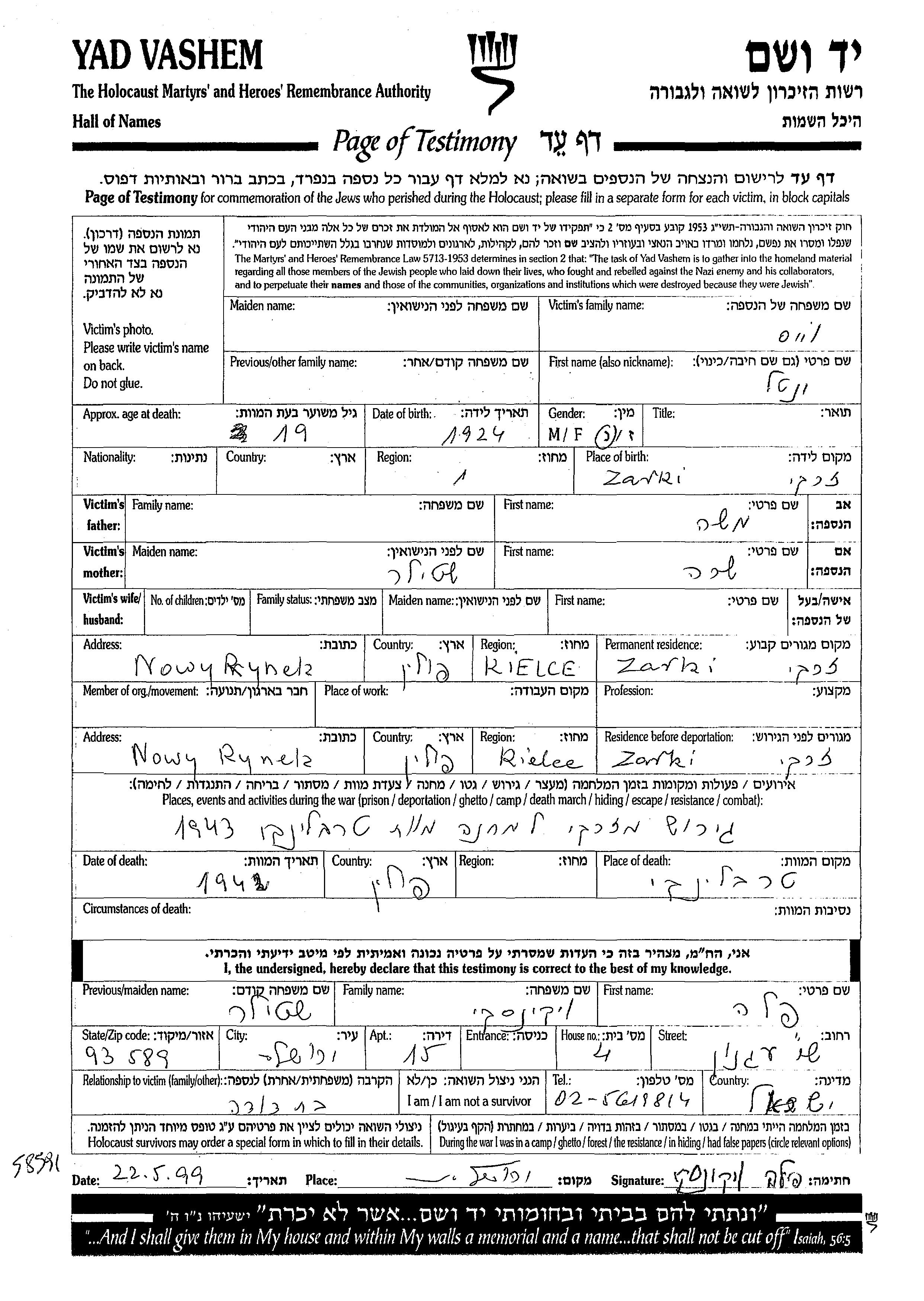 Veis | Yentl | 1924 | Zarki, Polonia | Hoja de Testimonio |