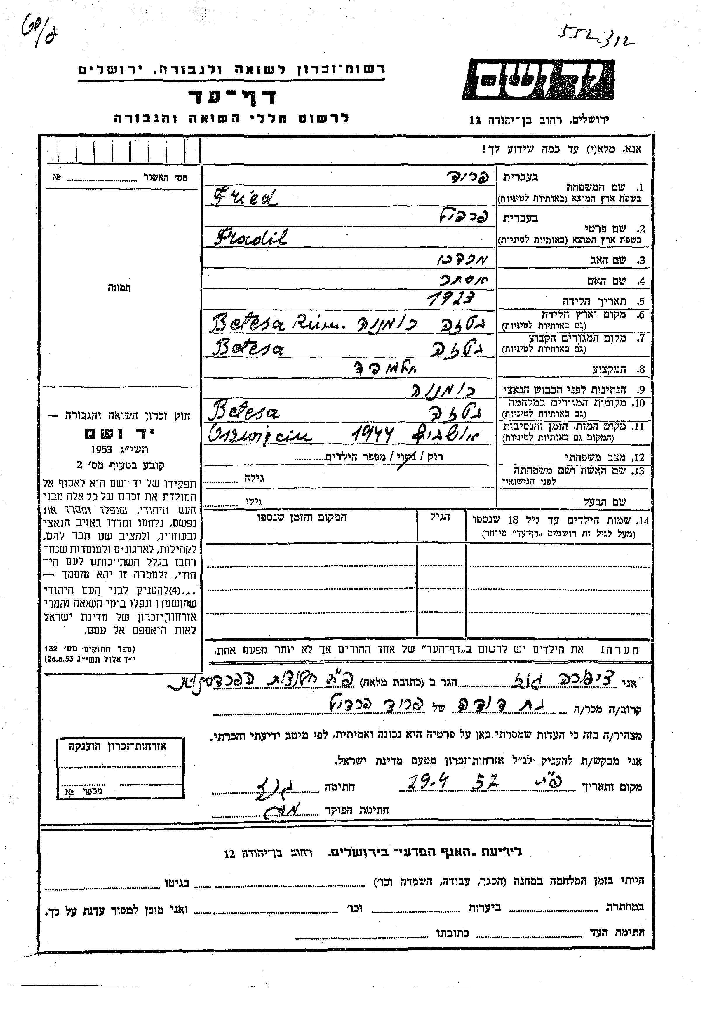 Fried Fradil 1923 Betesa, Rumania Hoja de Testimonio