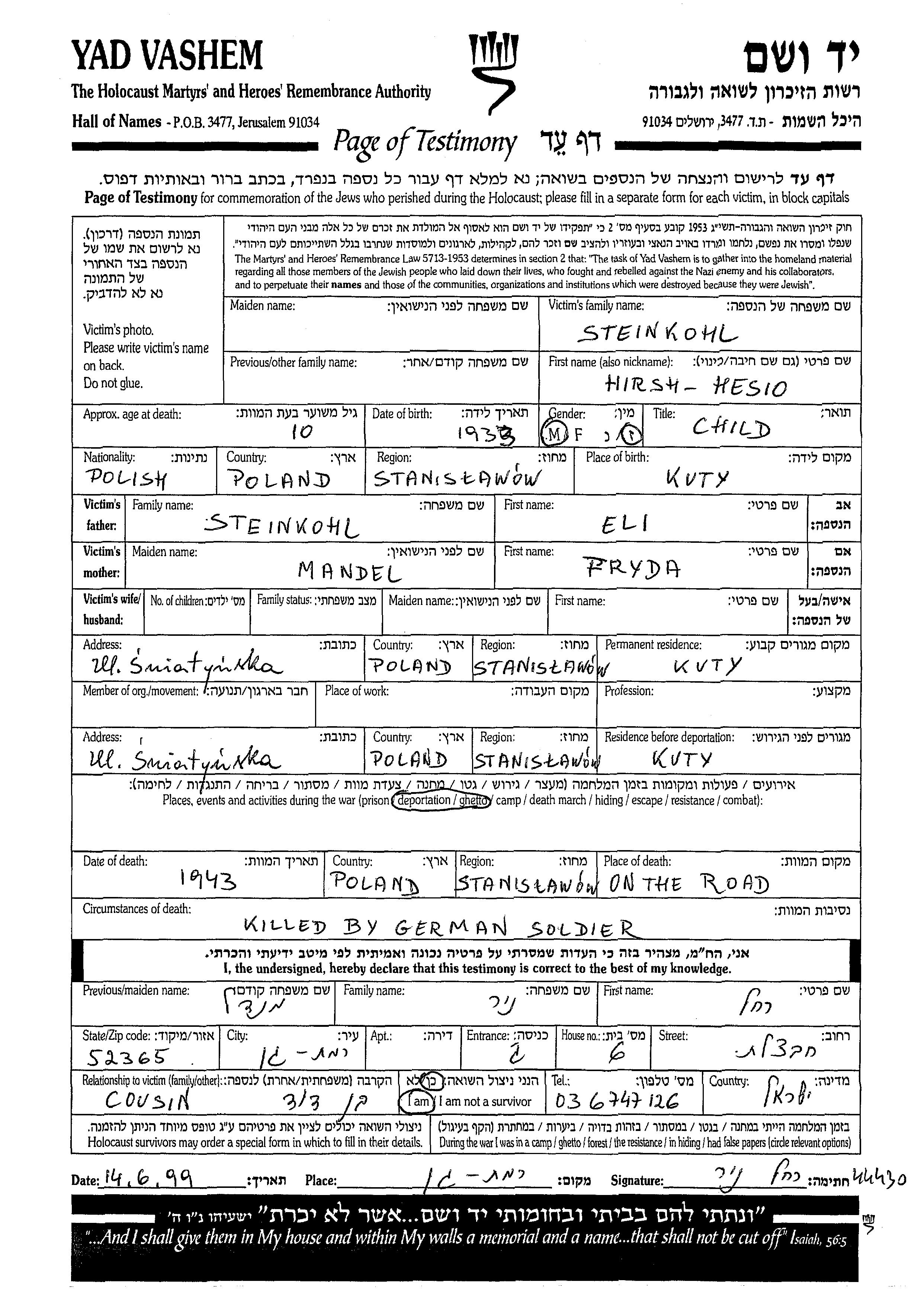 Steinkohl Hesio Kuty, Polonia Hoja de Testimonio