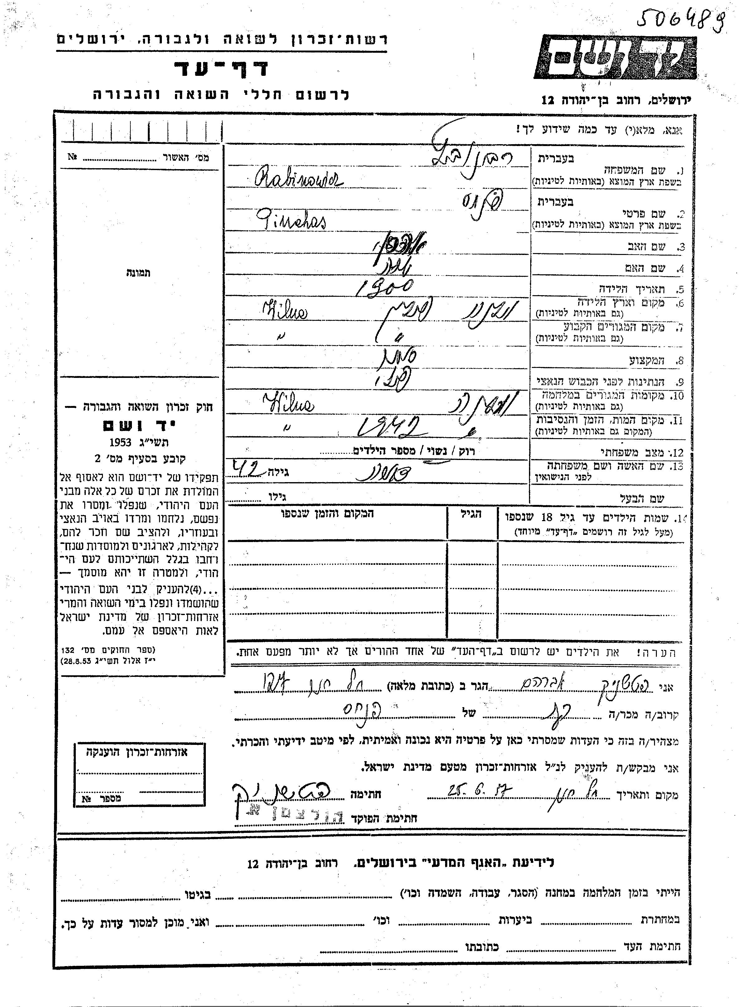 Rabinowicz | Pinchas | 1900 | Wilna, Polonia | Hoja de Testimonio |