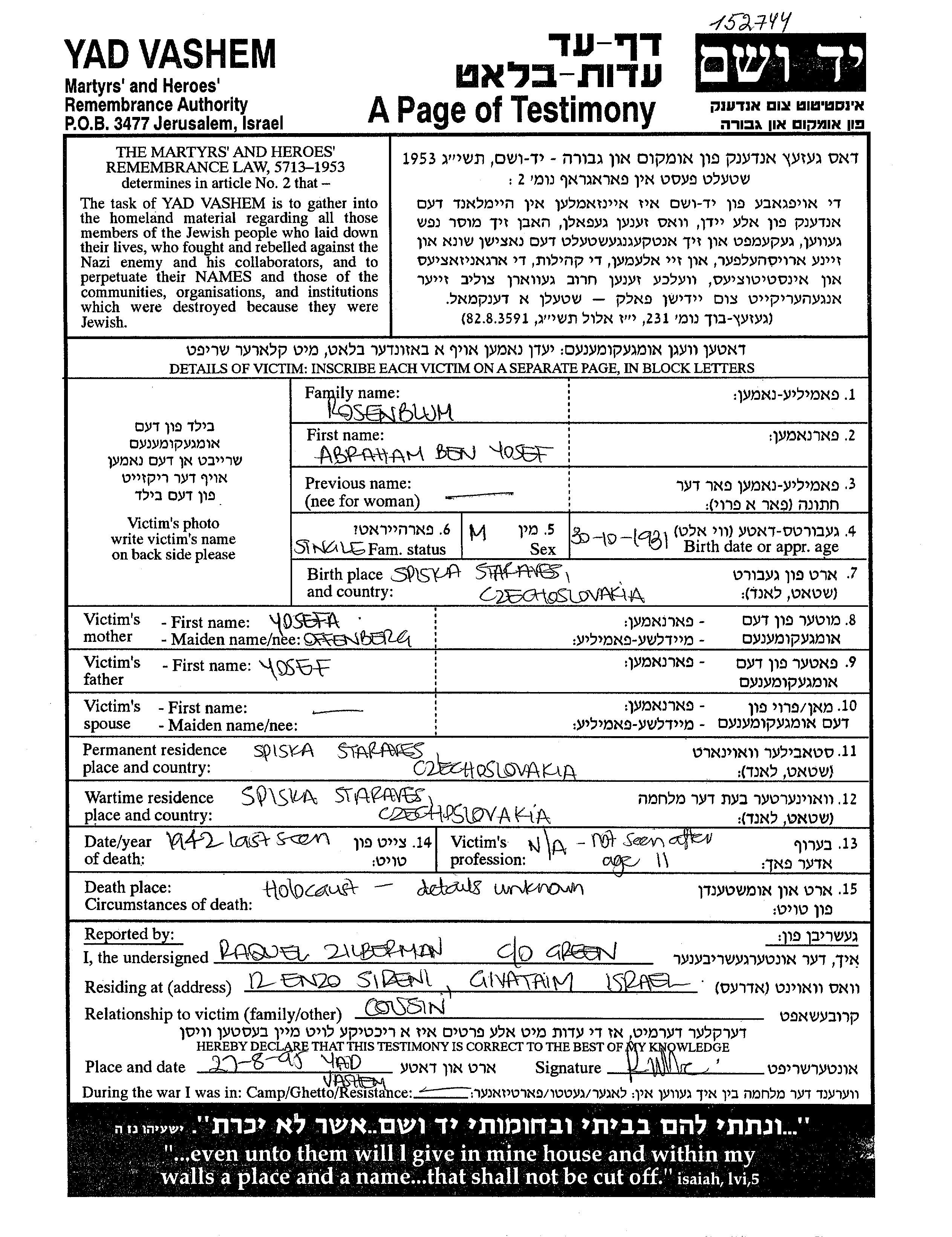Rosenblum Avraham Ves Spisska Stara, Checoslovaquia Hoja de Testimonio