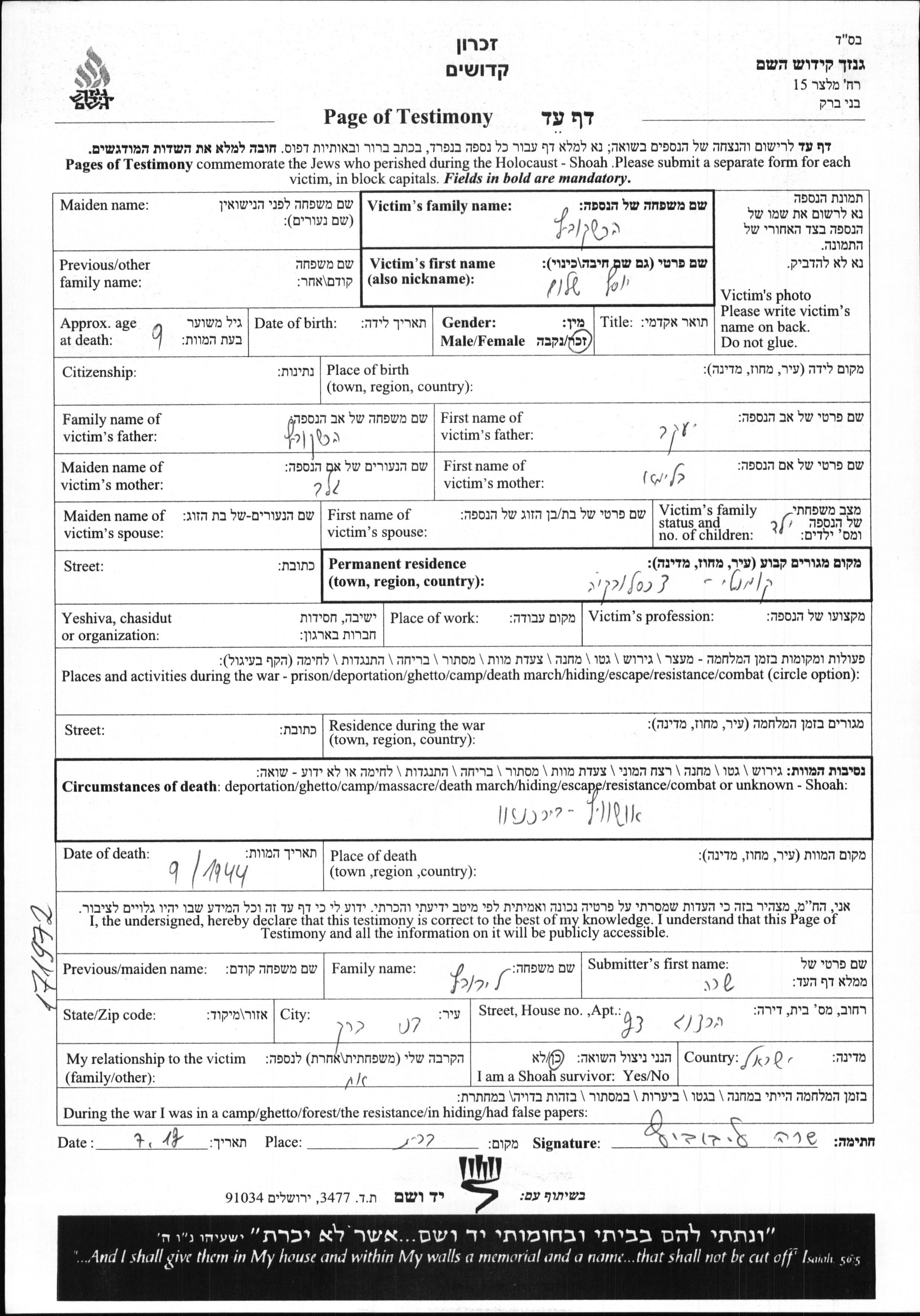 Yad Vashem - Colección conmemorativa de Hojas de Testimonio