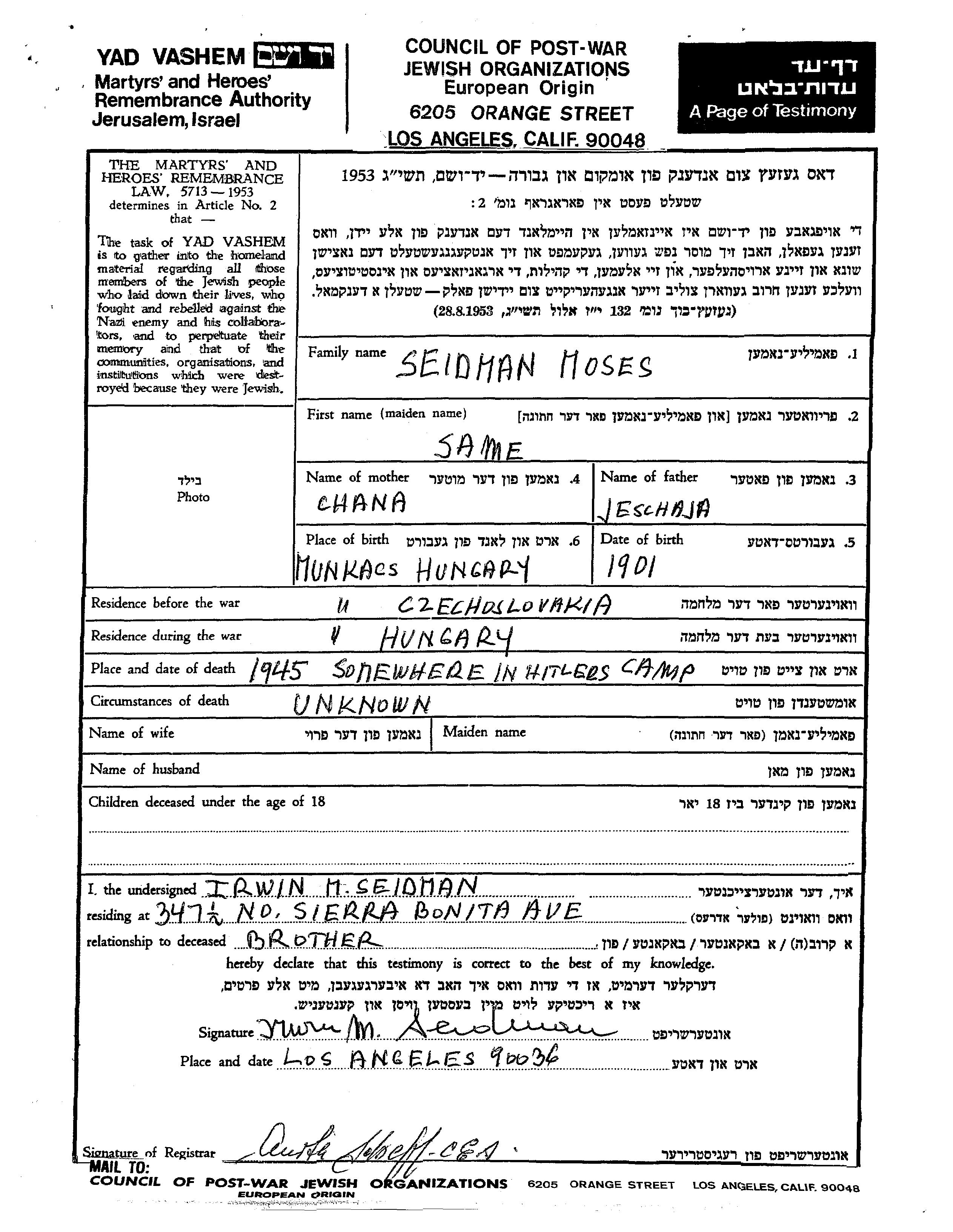 Seidman Moses 1901 Munkacs, Checoslovaquia Hoja de Testimonio