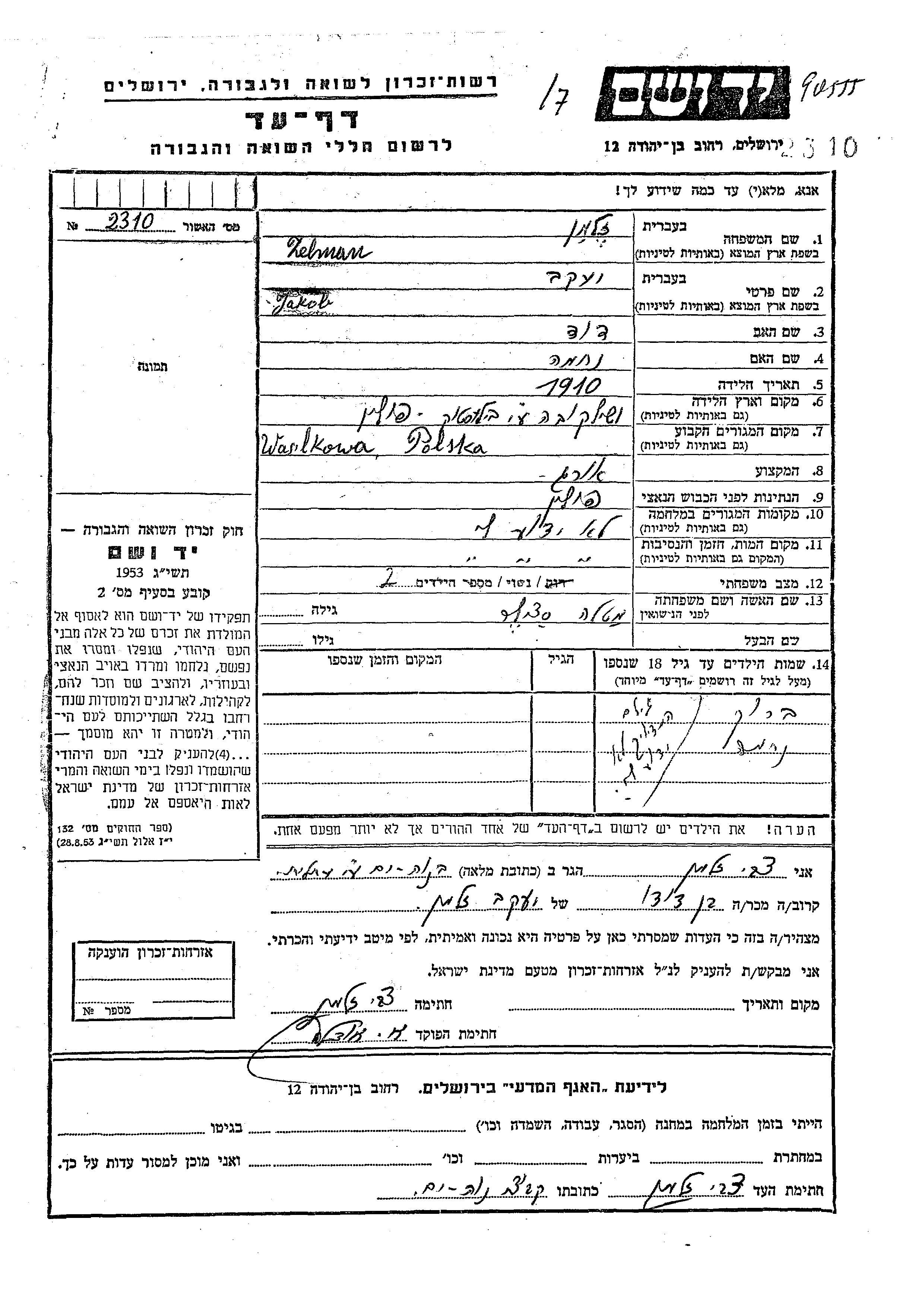 | Zelman | Yaakov | 1910 | Vashilkova, Polonia | Hoja de Testimonio |