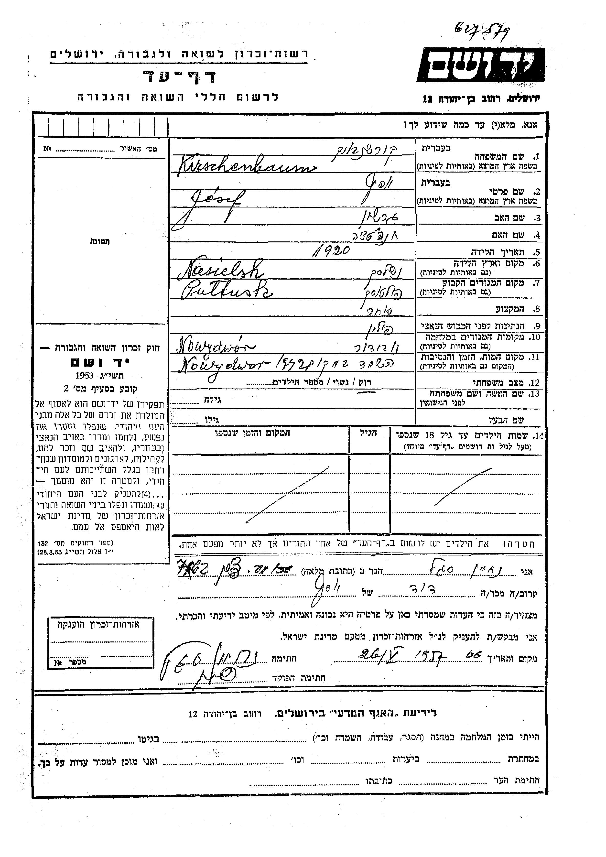 | Kirschenbaum | Josef | 1920 | Pultusk, Polonia | Hoja de Testimonio |
