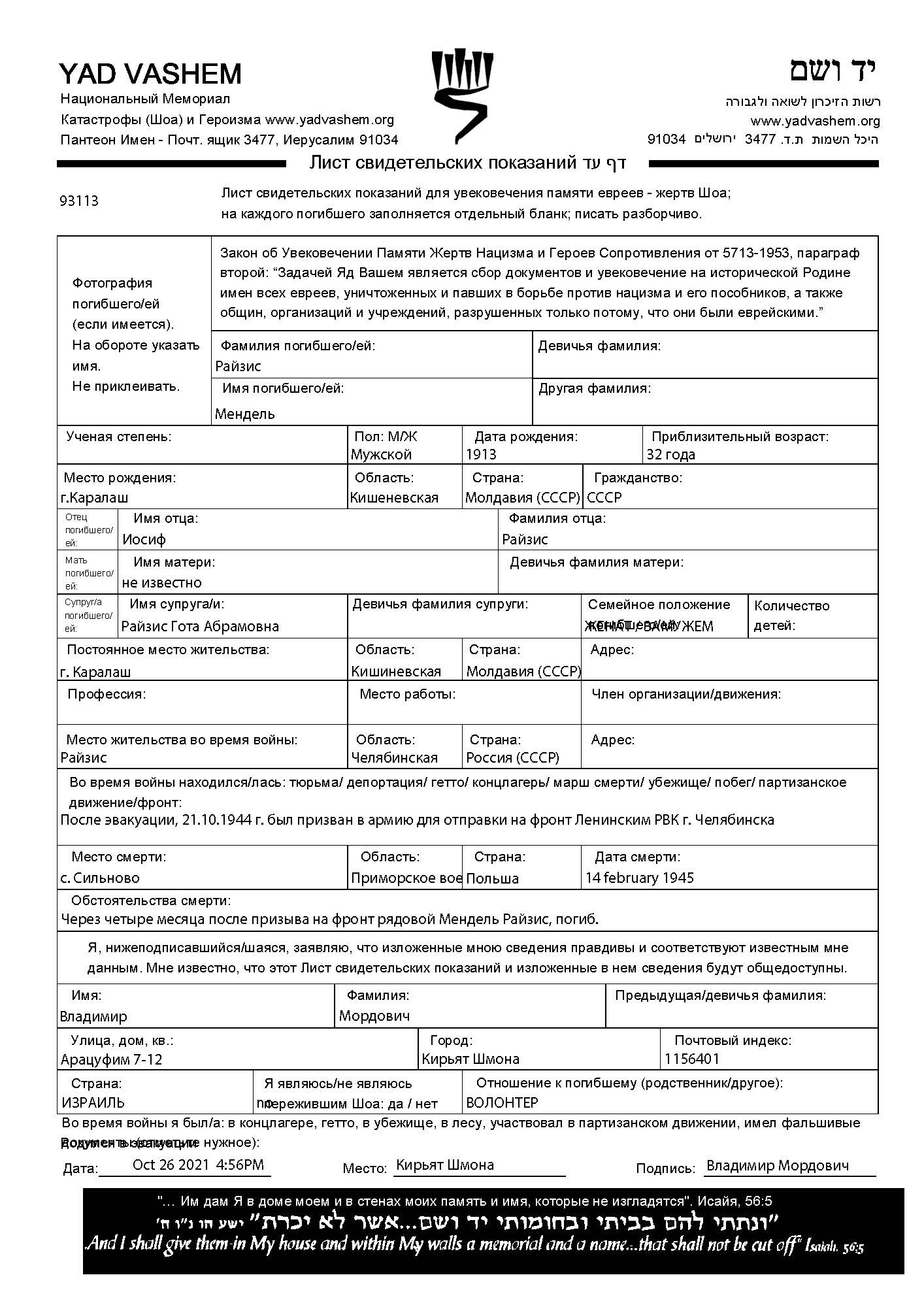 Rayzis Mendel 1913 Călărași, Rumania Hoja de Testimonio (digital)