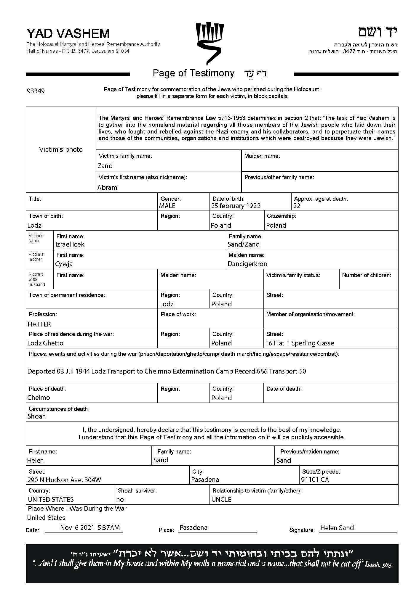 Zand Abram 1922 Lodz, Polonia Hoja de Testimonio (digital)