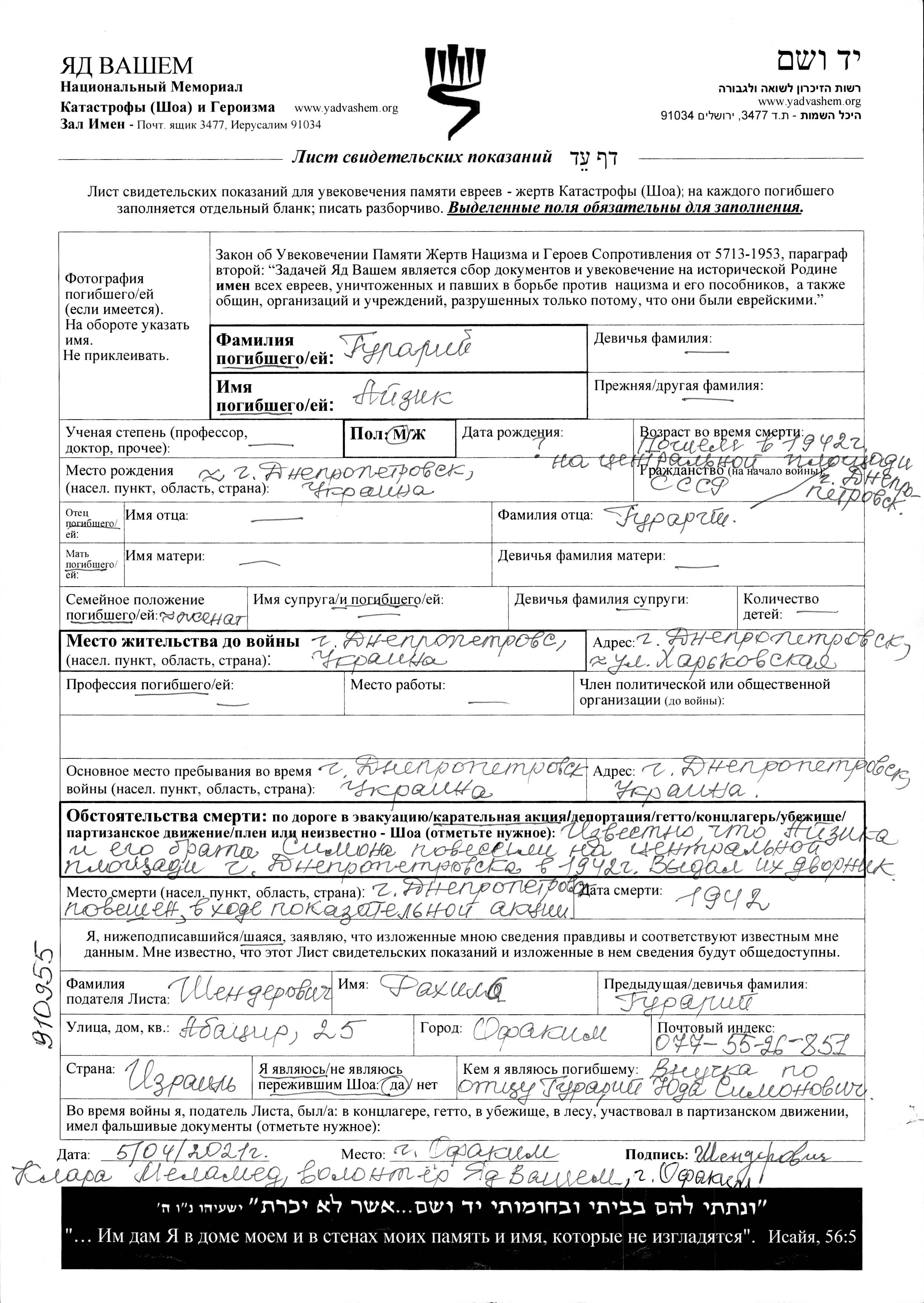 Gurariy Ayzik Dnepropetrovsk, Ucrania (URSS) Hoja de Testimonio