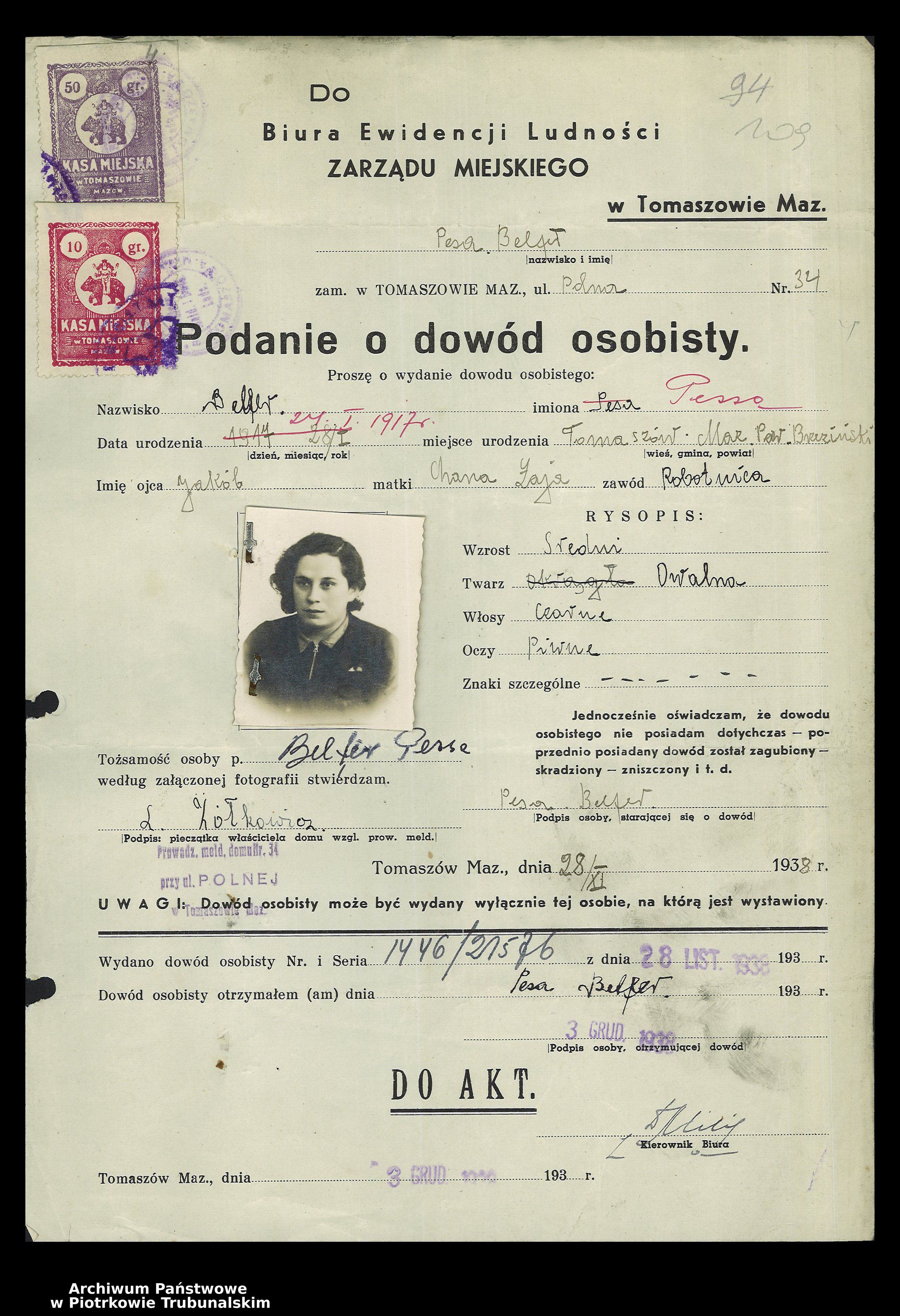 Belfer Pessa 1917 Tomaszow Mazowiecki, Polonia Application