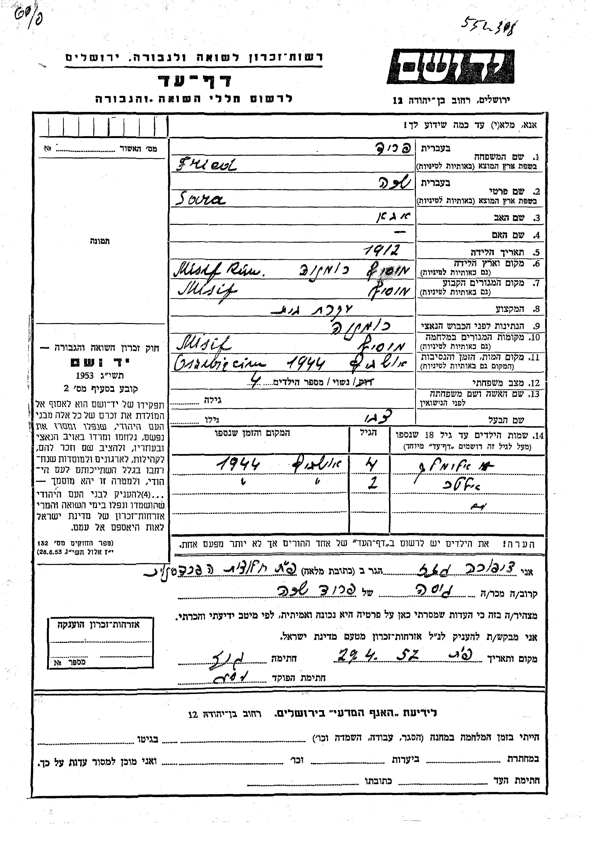 Fried Sara 1912 Moisei, Rumania Hoja de Testimonio