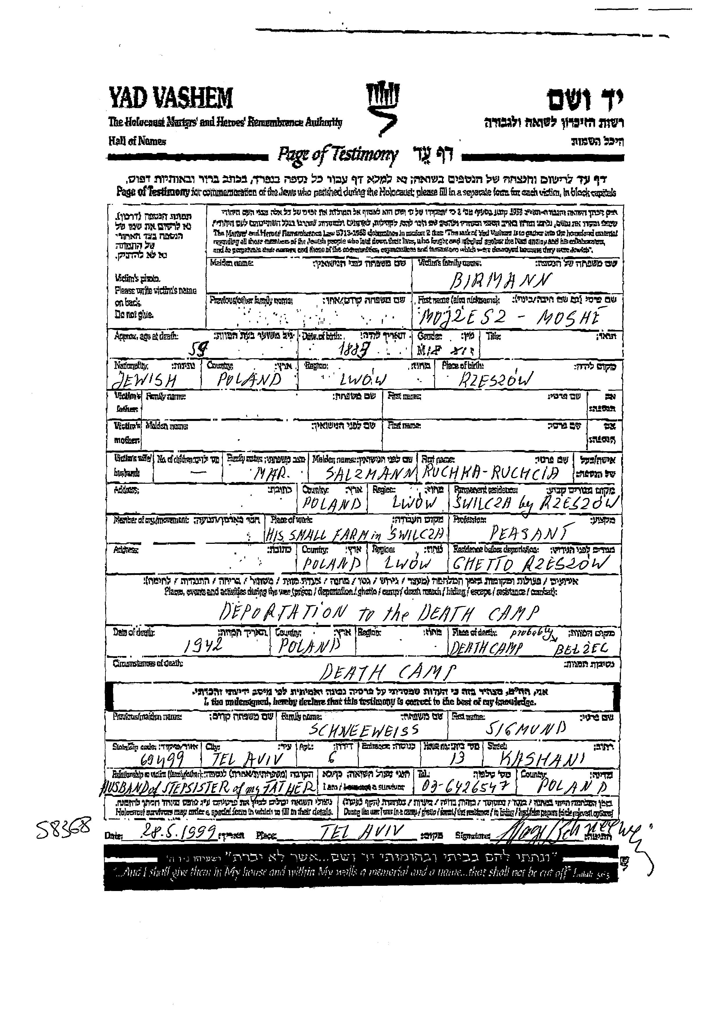 Birman Moshe 1878 Rzeszow, Polonia Hoja de Testimonio