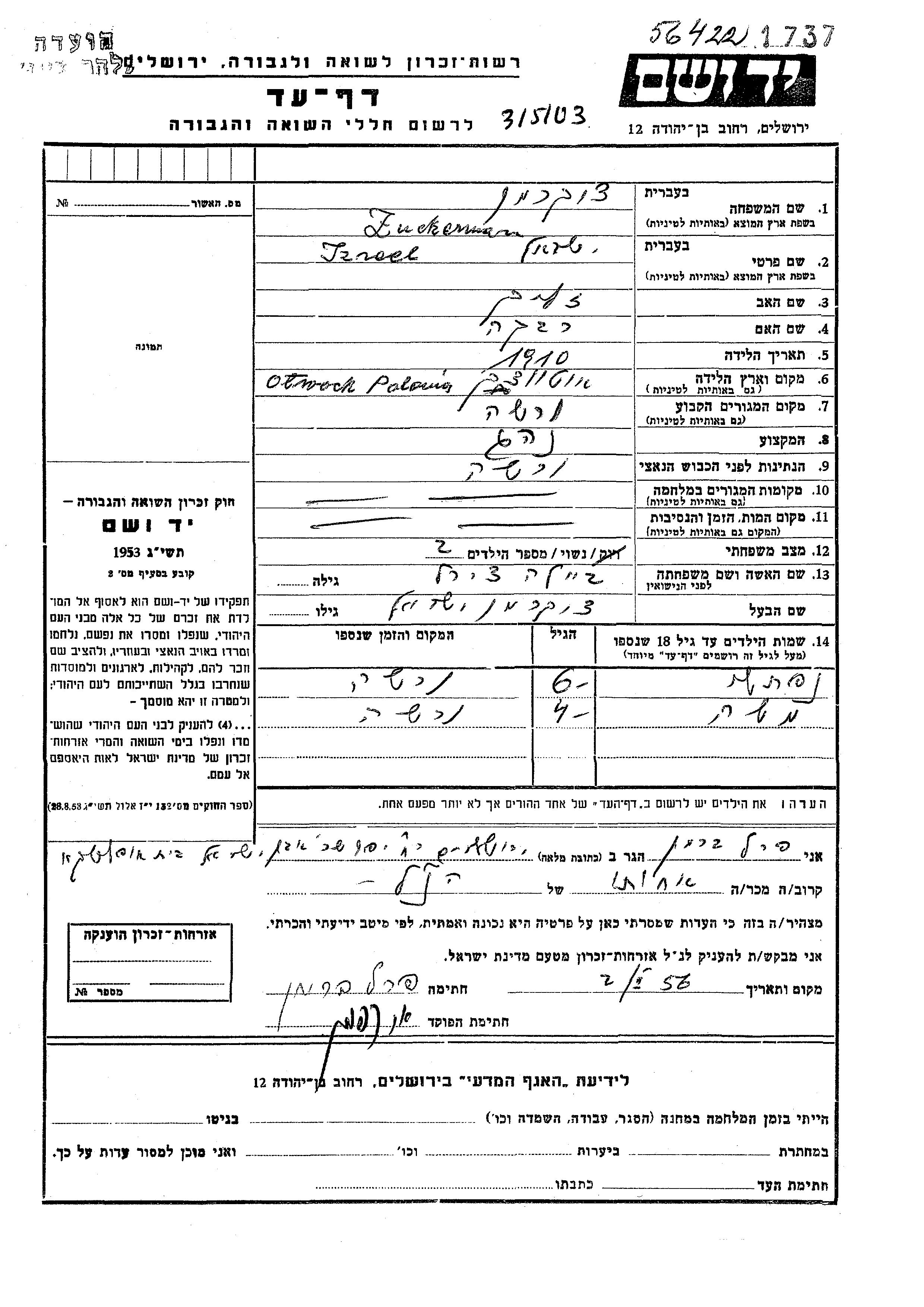 Zuckerman Ysrael 1910 Warszawa, Polonia Hoja de Testimonio