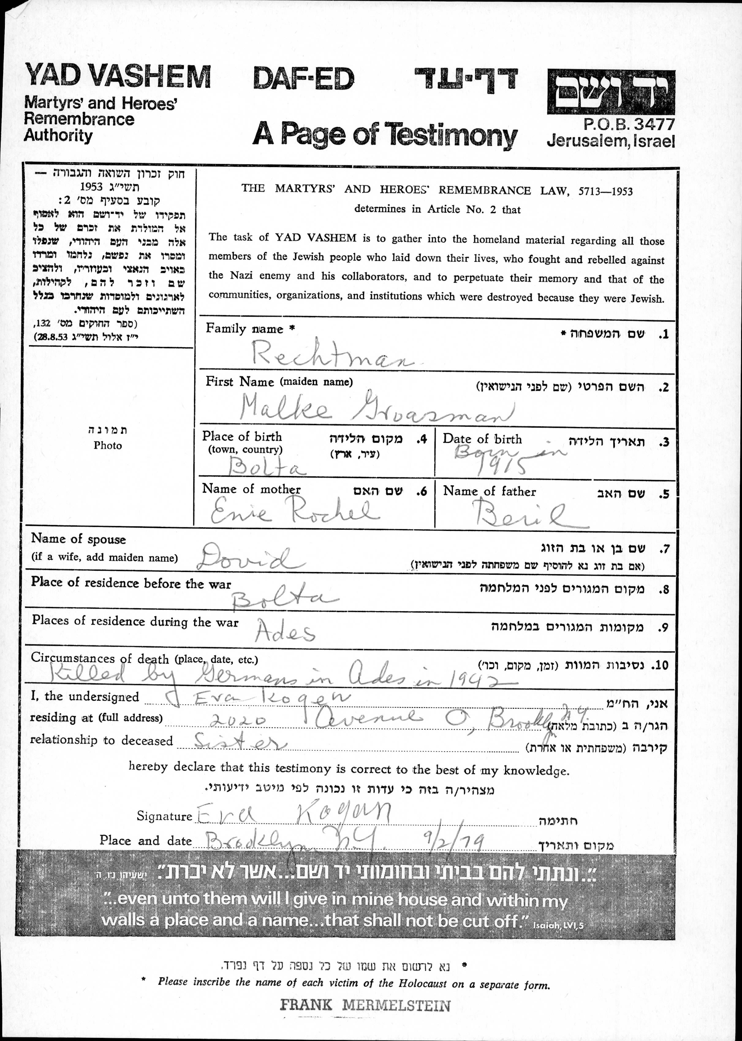 Rechtman Malke 1915 Bolta, Rumania Hoja de Testimonio