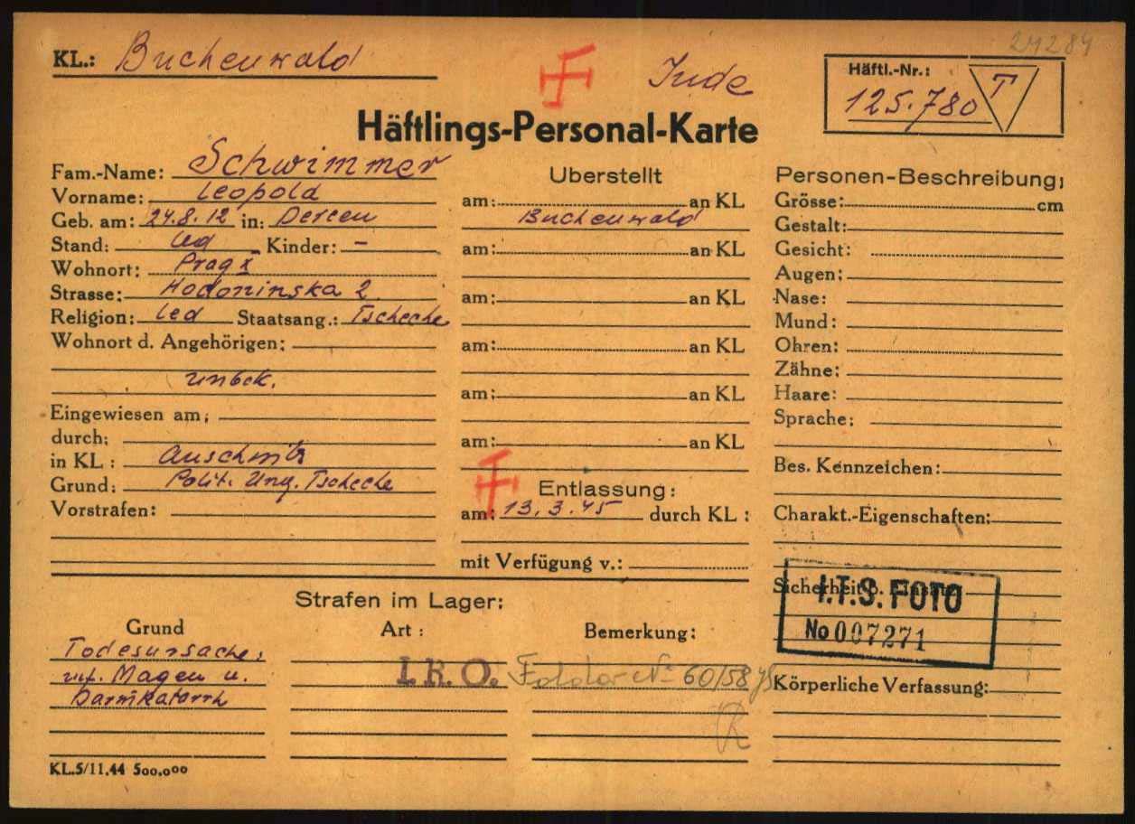 Schwimmer Leopold 1912 Praga Area, Checoslovaquia ITS card file