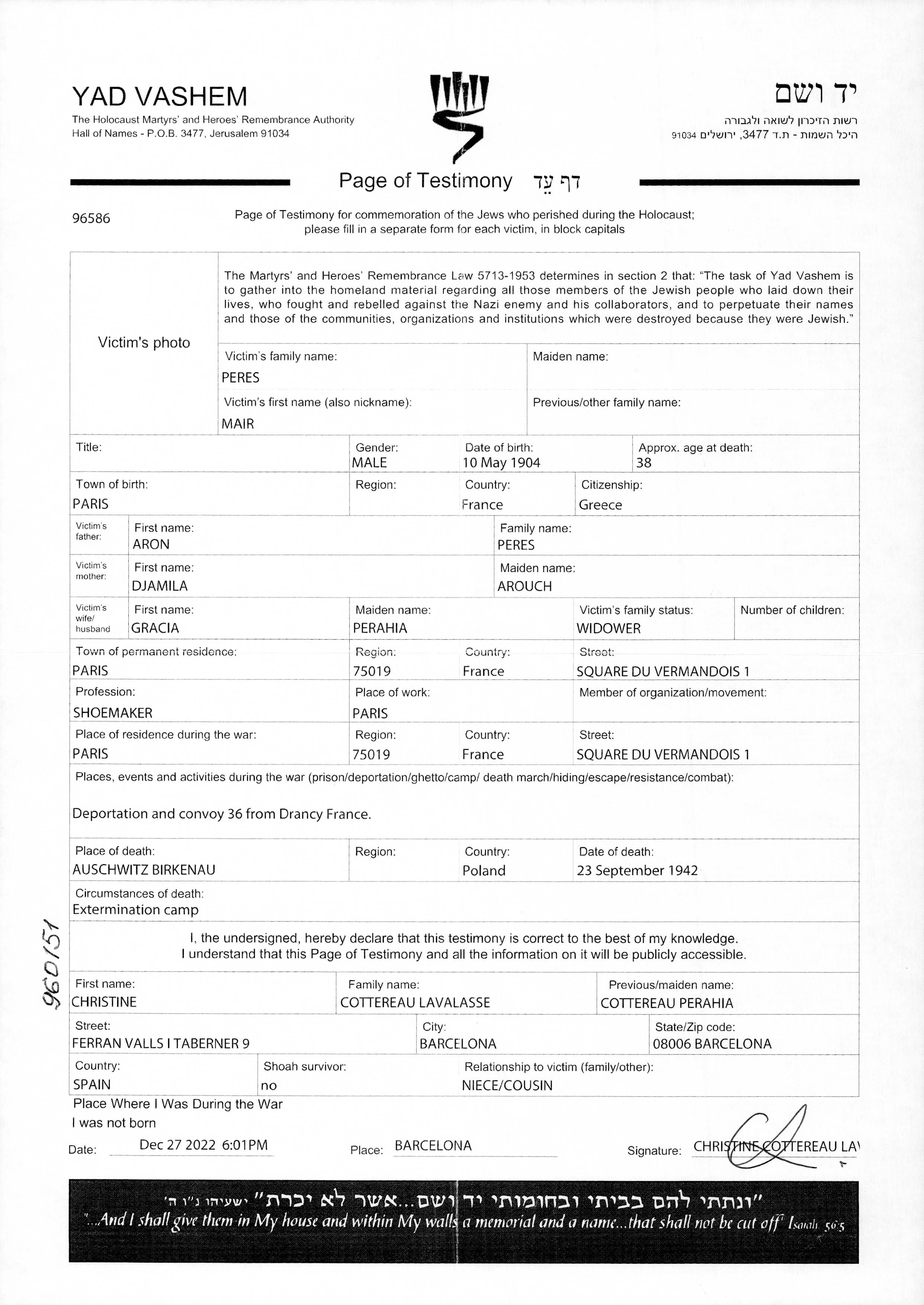Mair Peres nació en Saloniki, Grecia en 1904. Era Zapatero/a. Antes de la segunda guerra mundial vivía en Paris, Francia.