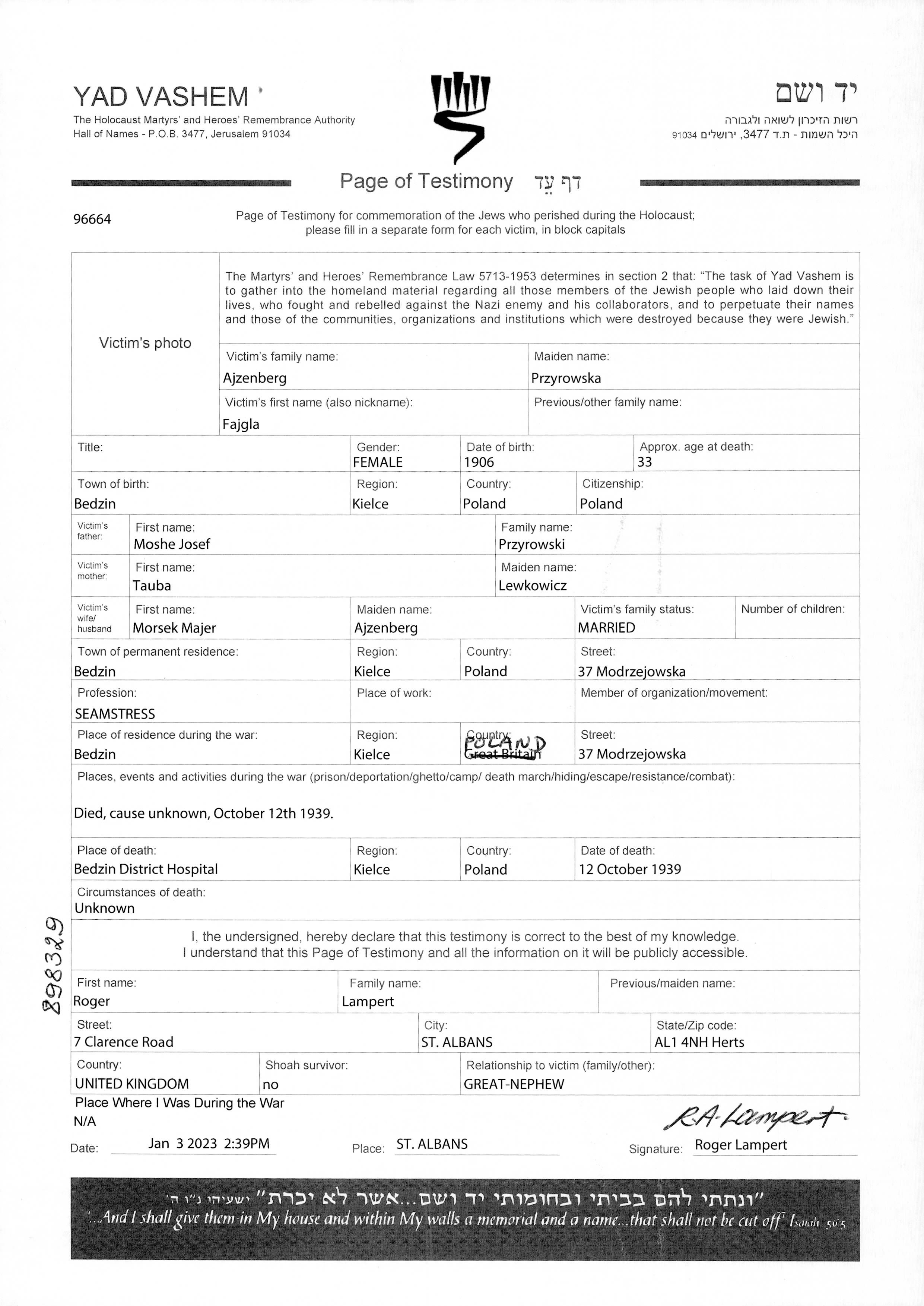 Fajgla Ajzenberg apellido de soltera Przyrowska nació en Będzin, Polonia en 1906. Era Costurera. Antes de la segunda guerra mundial vivía en Będzin, Polonia. Fajgla fue asesinada durante la Shoá. Lugar de la muerte: Będzin, Polonia en 12 October 1939.
