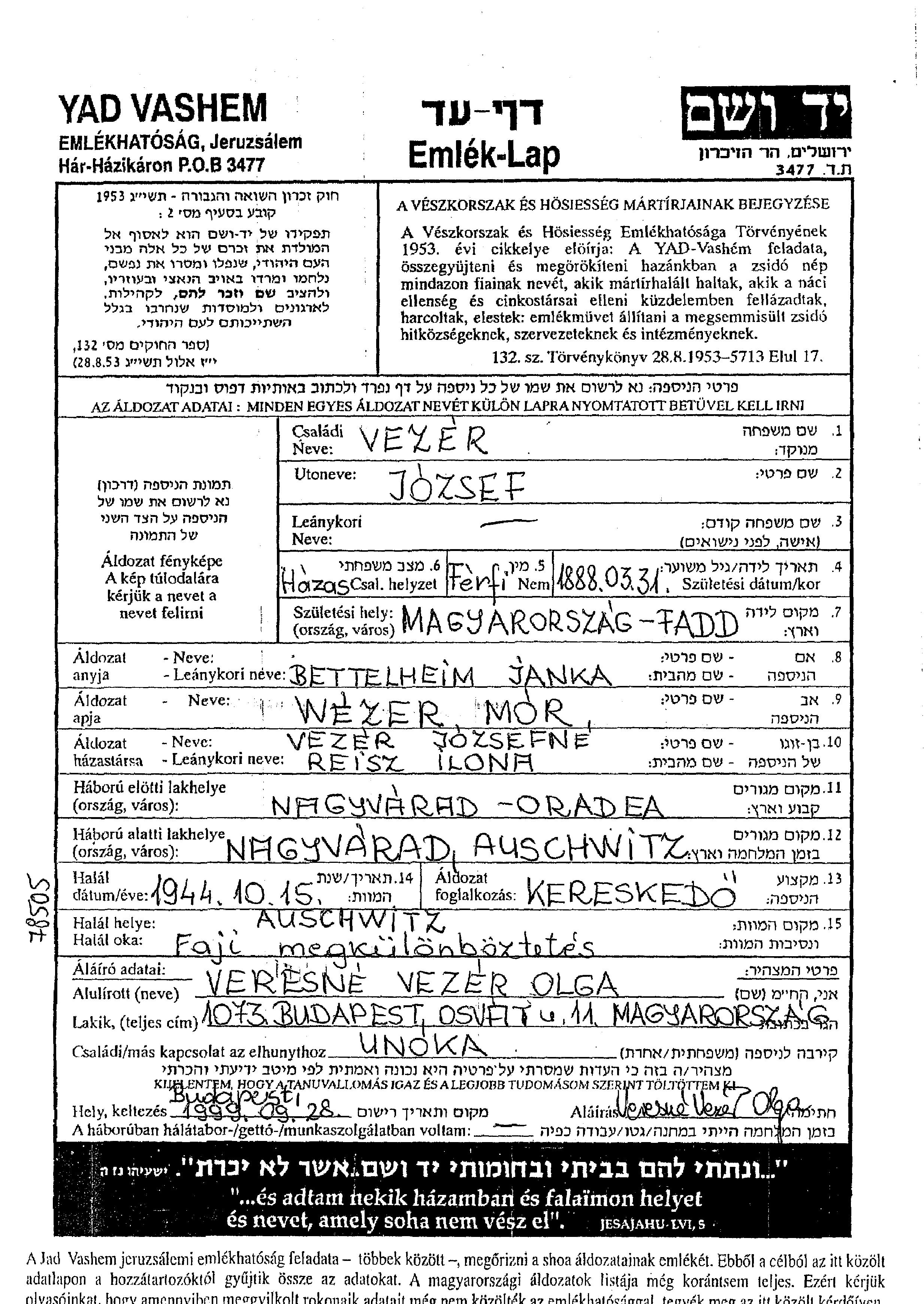 Vezer Jozsef Nagyvarad, Rumania lista de judíos asesinados registrados en Libros memoriales