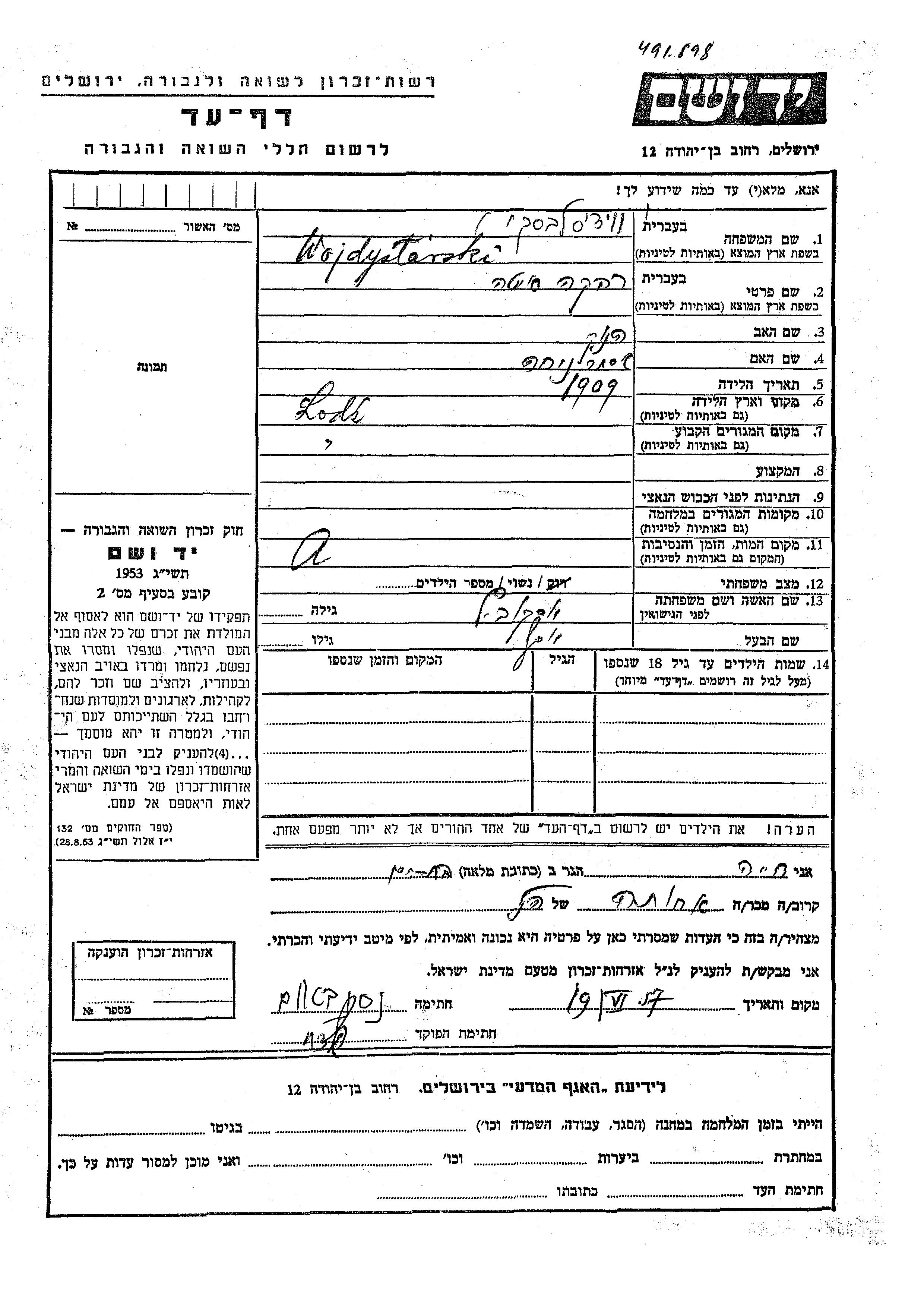 Wojdyslavski Rivka Ita 1909 Lodz, Polonia Hoja de Testimonio