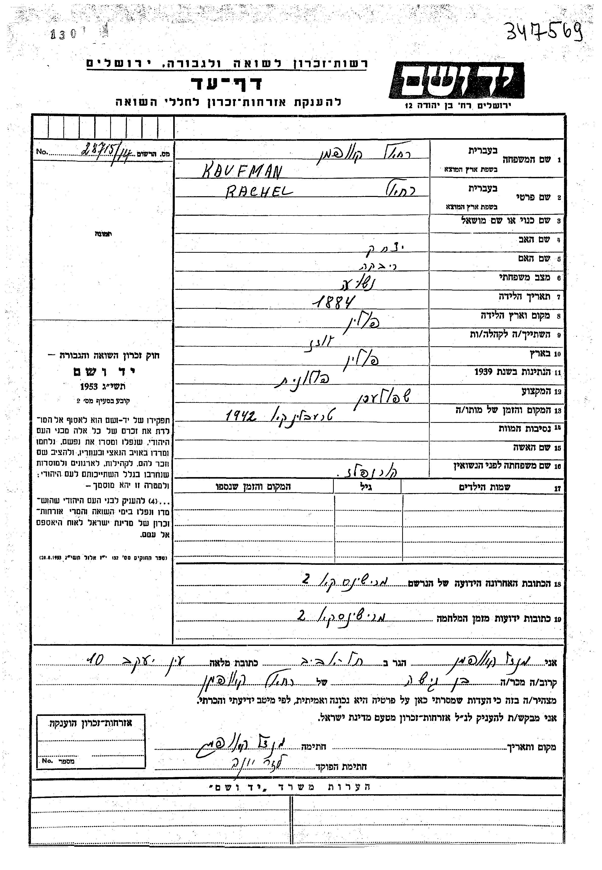 Rachel Kaufman apellido de soltera Hornfeld nació en Polonia en 1884, hija de Yitzkhak y Rivka. Era שפולער y casada. Antes de la segunda guerra mundial vivía en Lodz, Polonia. Durante la guerra estuvo en Lodz, Polonia.