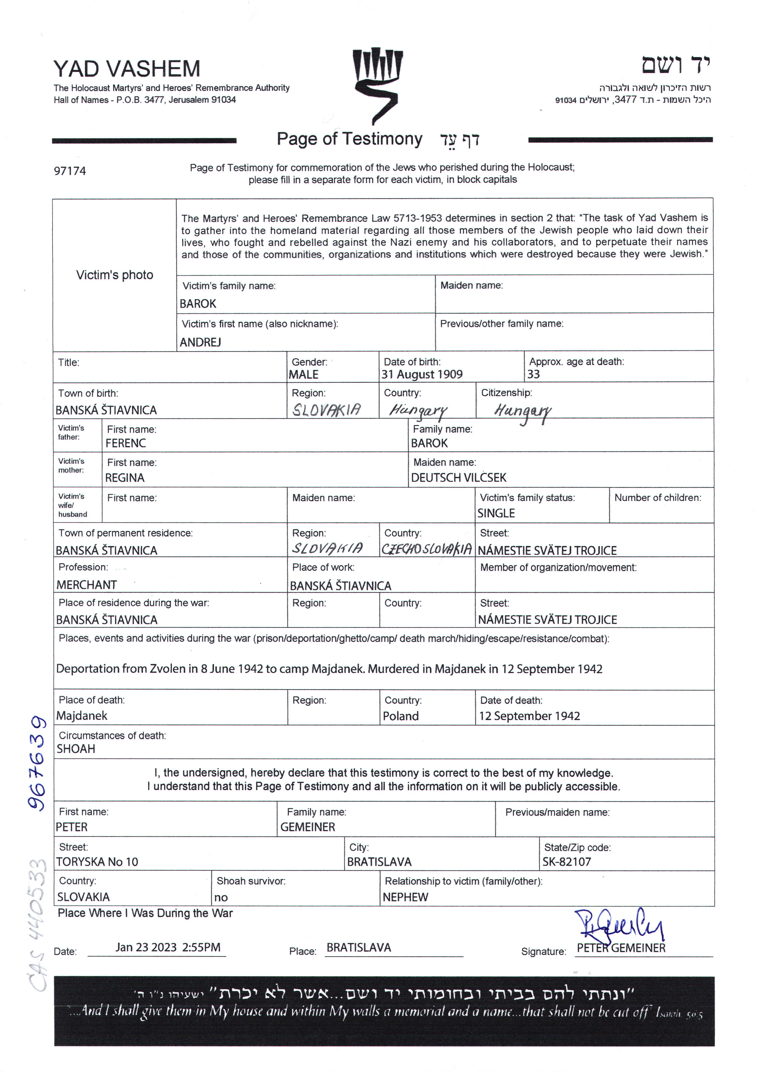 Andrej Barok nació en Banska Stiavnica, Checoslovaquia en 1909. Era Comereciante. Antes de la segunda guerra mundial vivía en Banska Stiavnica, Checoslovaquia. Andrej fue asesinado durante la Shoá. Lugar de la muerte: Majdanek, Polonia en 12/09/1942.