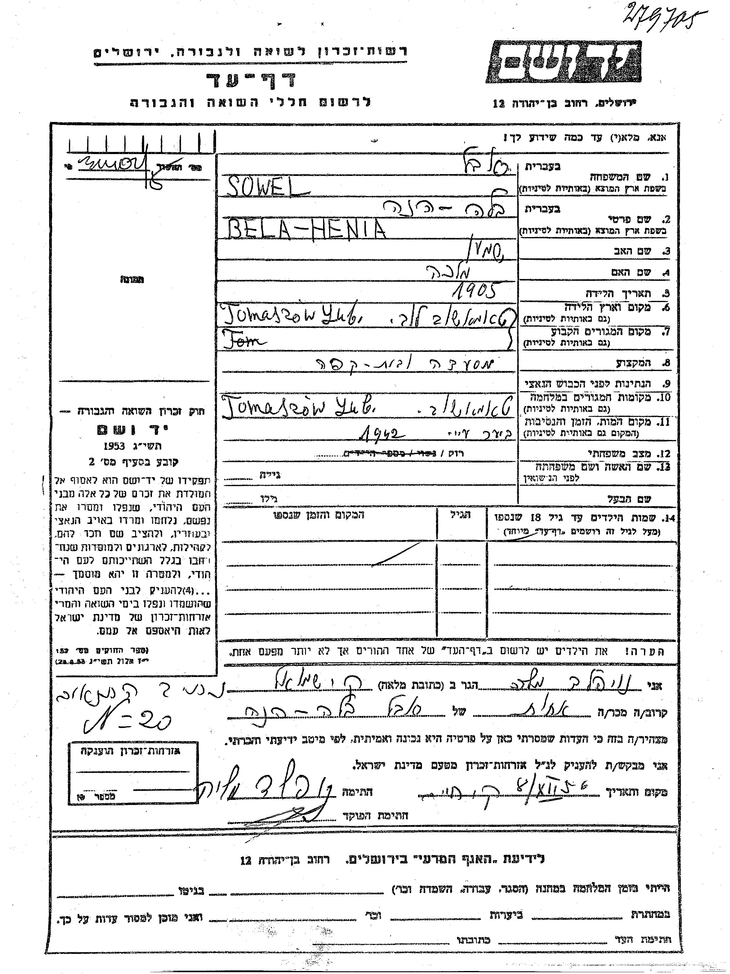 Sowel Sobel Henia Bela 1905 Tomaszow, Polonia Hoja de Testimonio