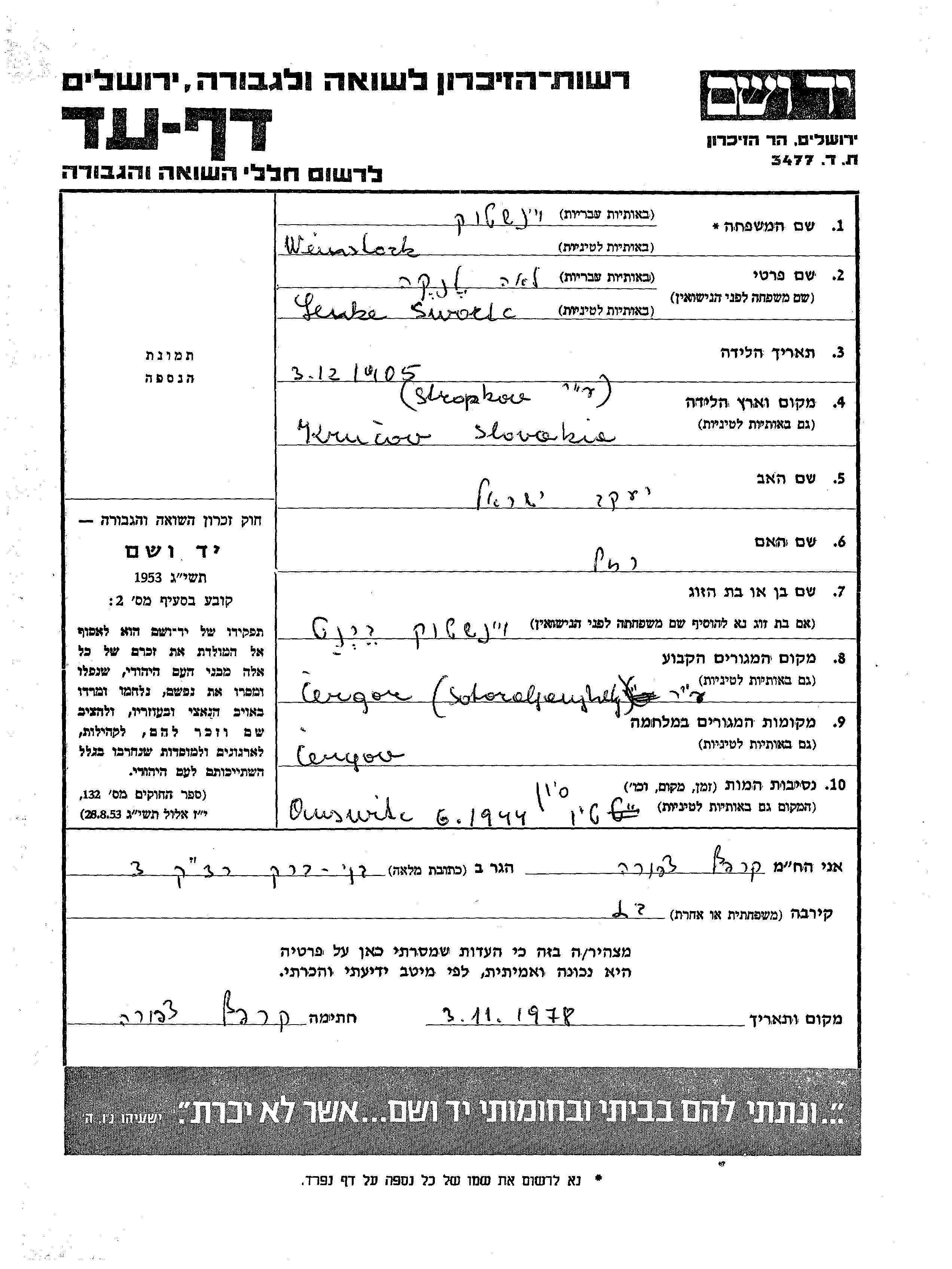 Yad Vashem - Colección conmemorativa de Hojas de Testimonio