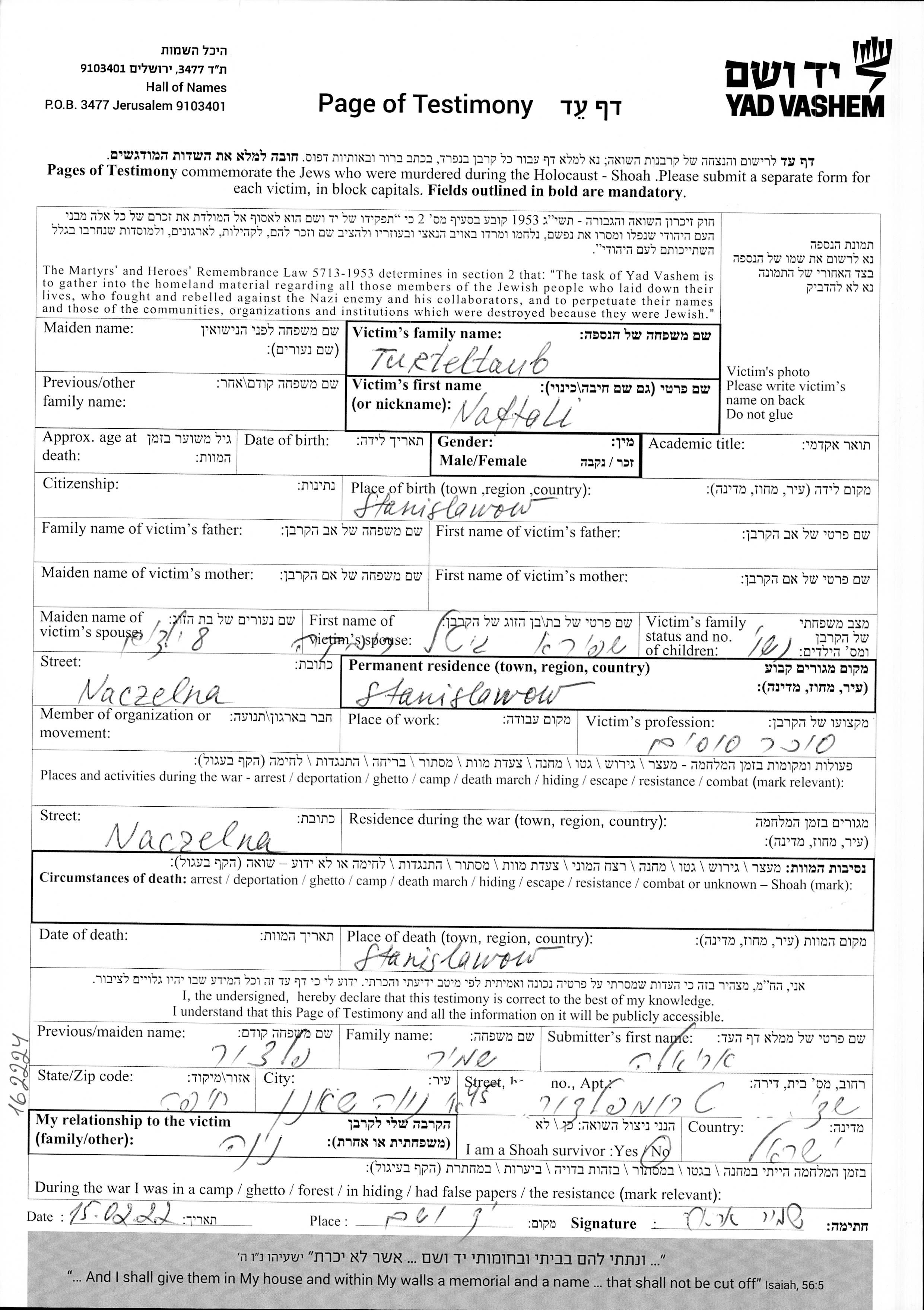 Turteltaub Naftali Stanislawow, Polonia Hoja de Testimonio