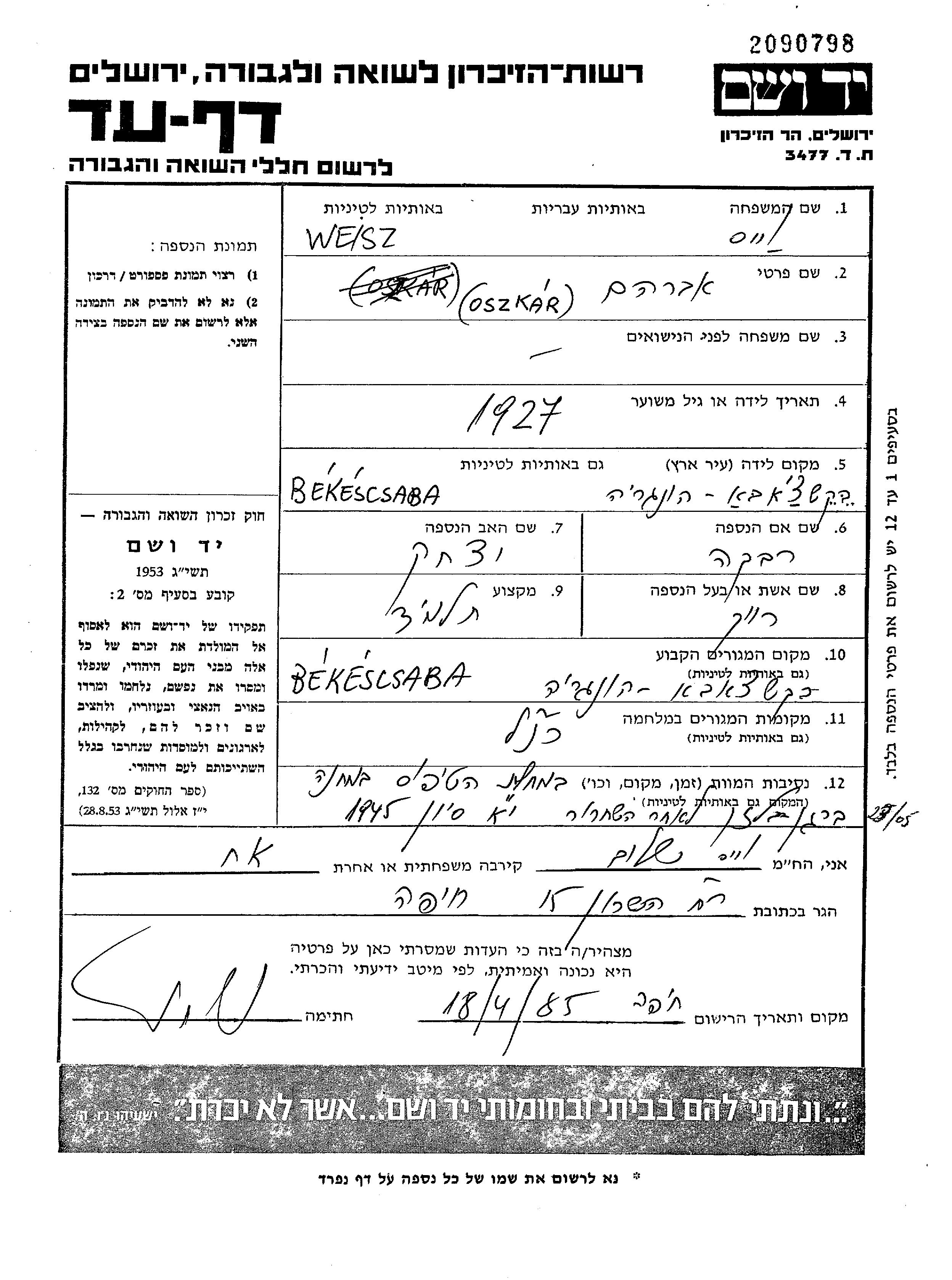 Weisz Oszkar Avraham 1927 Békéscsaba, Hungría Hoja de Testimonio