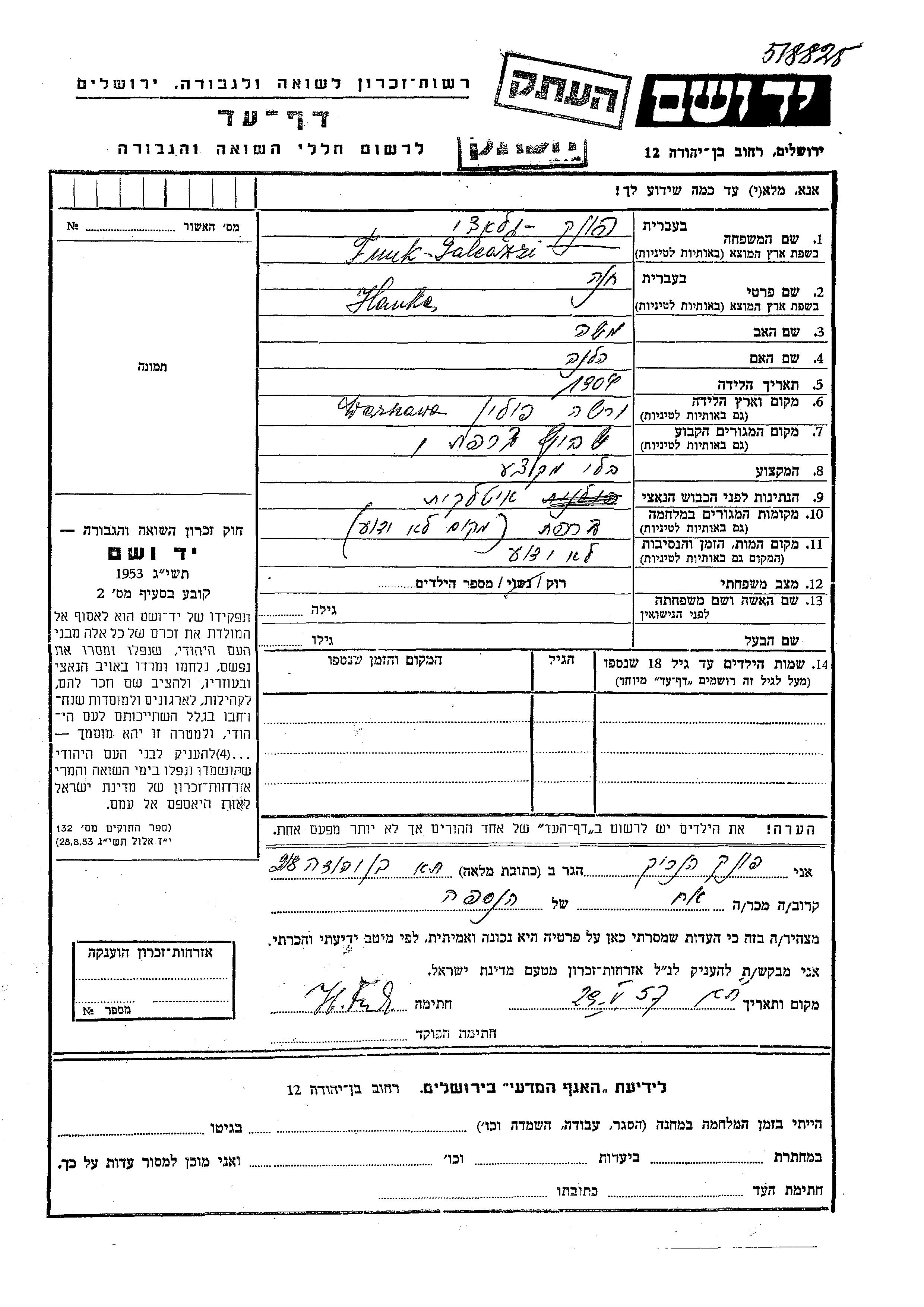 Yad Vashem - Colección conmemorativa de Hojas de Testimonio