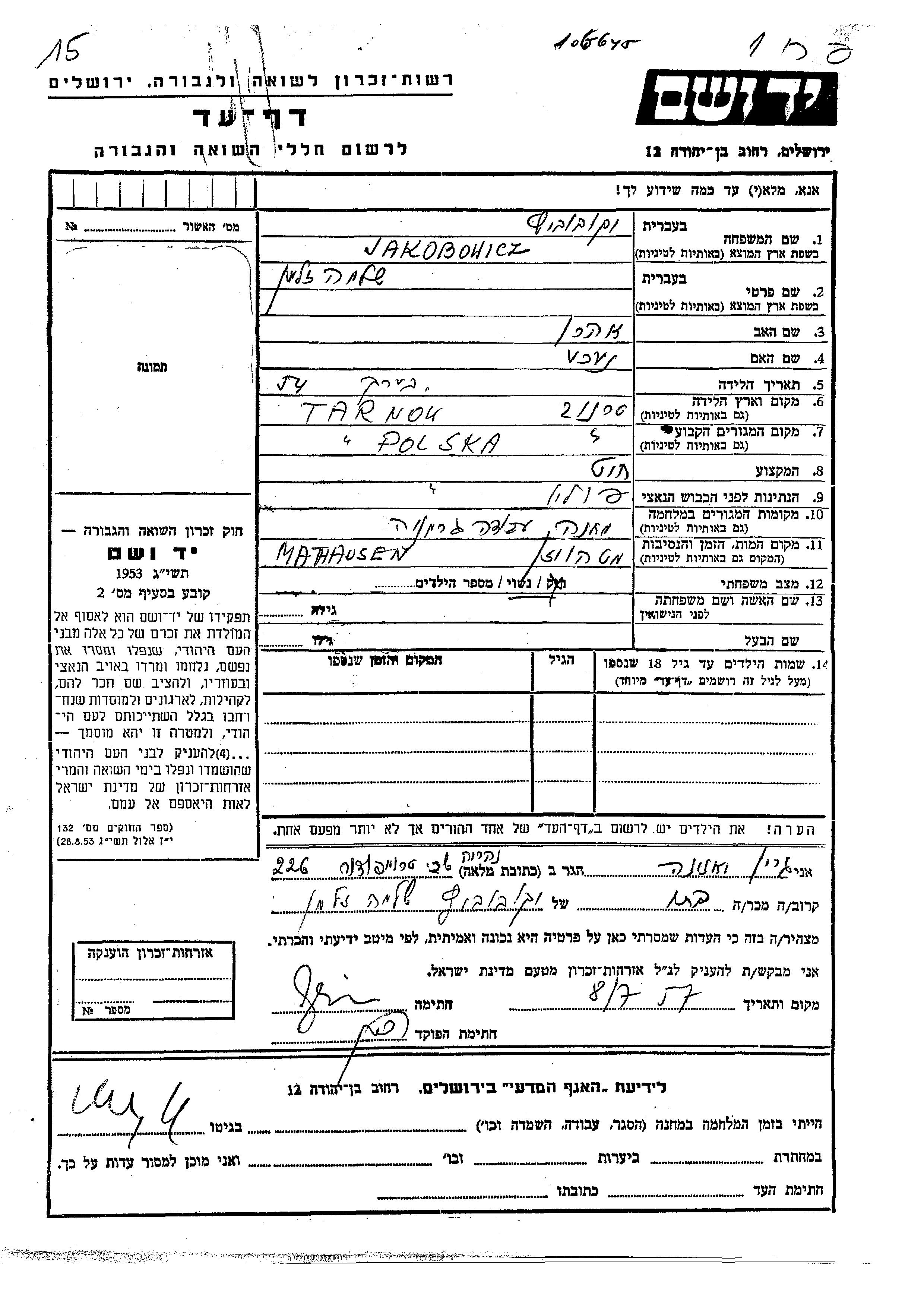 Jakobowicz Shlomo Zalman Tarnow, Polonia Hoja de Testimonio