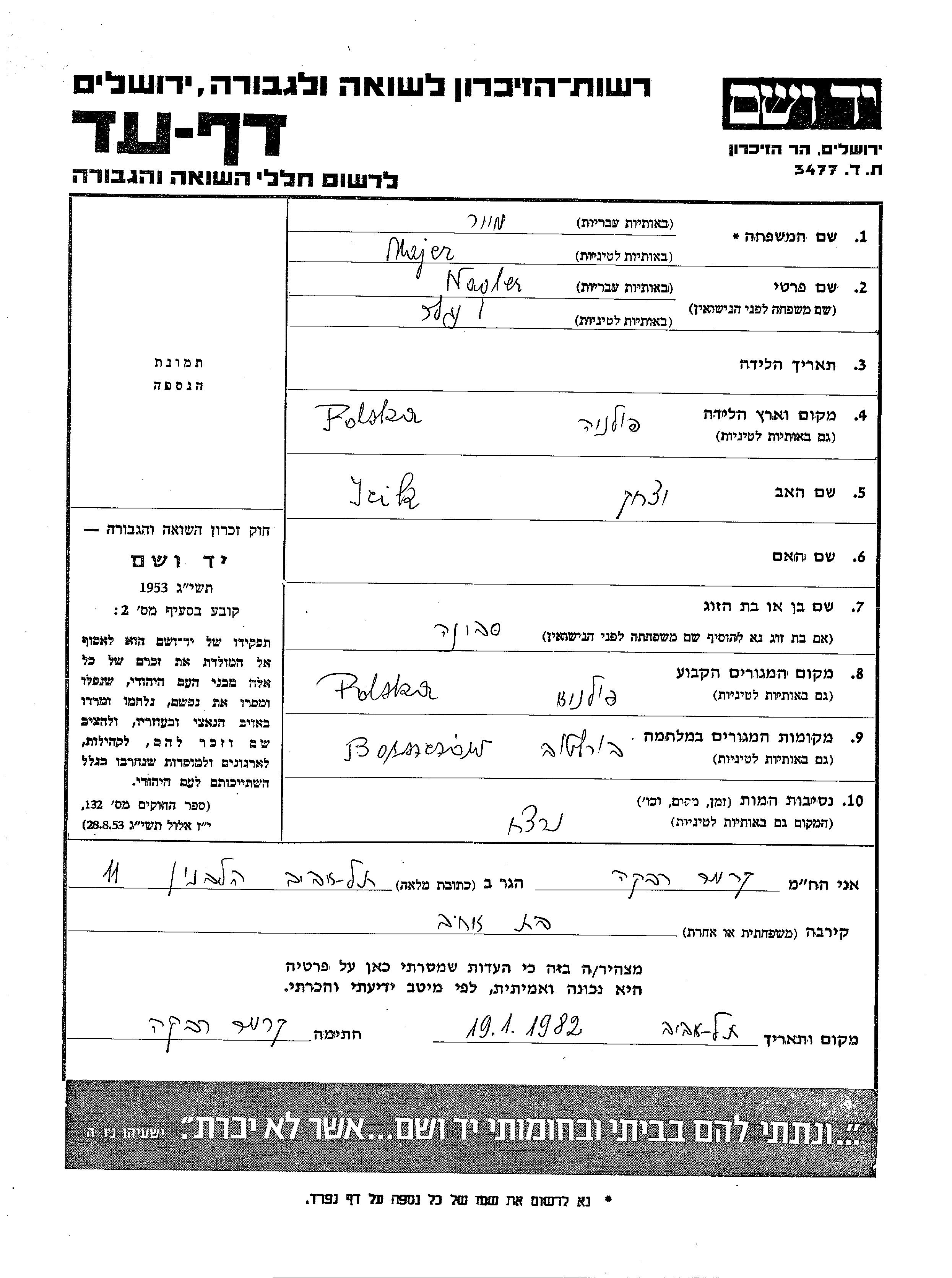 Majer Nagler nació en Polonia, hijo de Jcik. Era Casado con Sabina. Antes de la segunda guerra mundial vivía en Polonia. Durante la guerra estuvo en Borszczow, Polonia.
