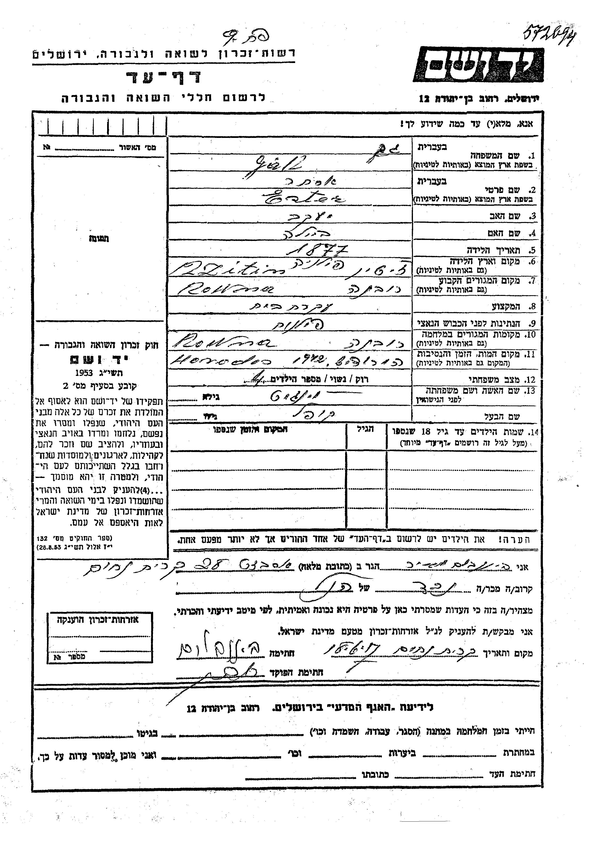 Yad Vashem - Colección conmemorativa de Hojas de Testimonio