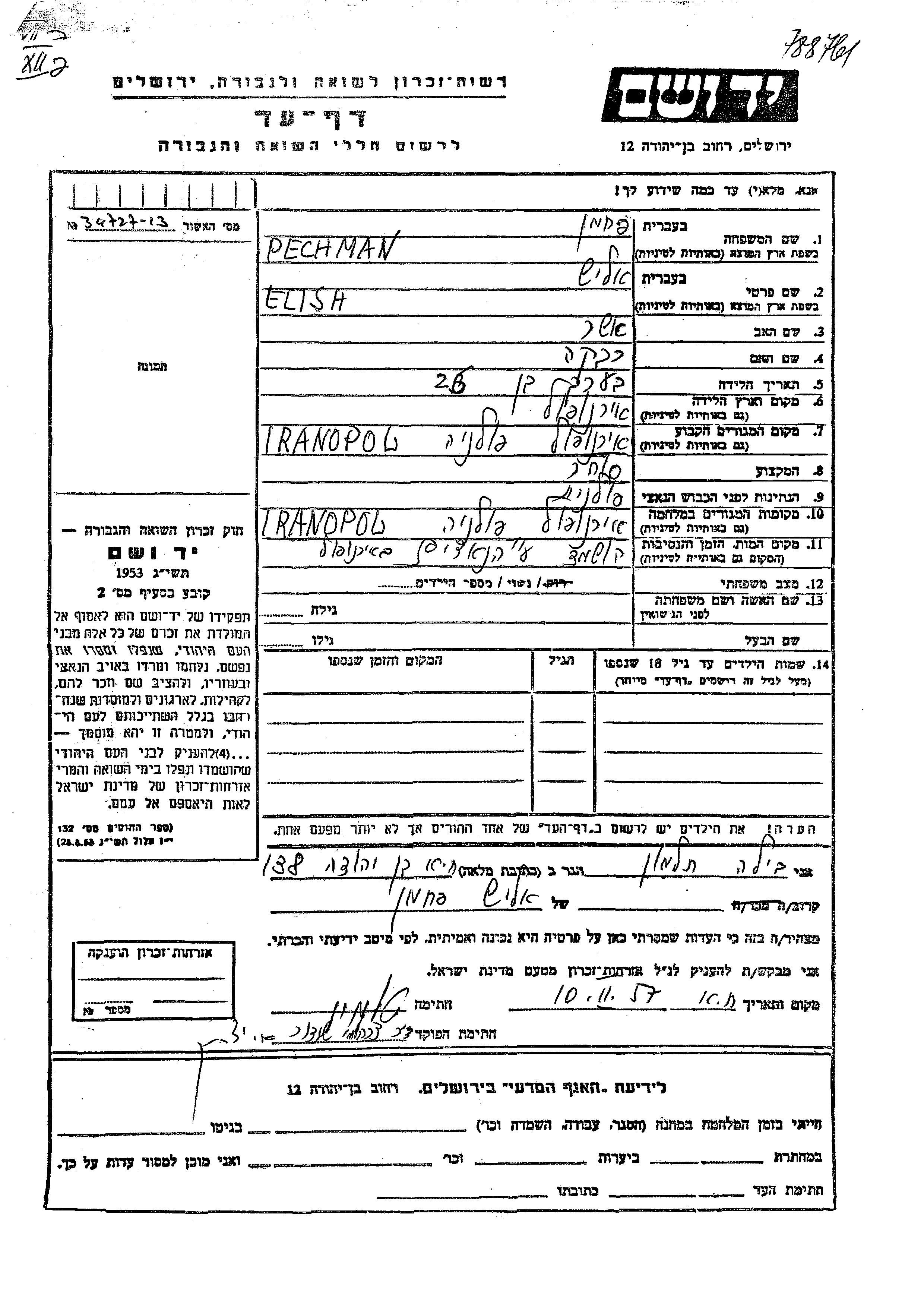 Elish Pechman nació en Tarnopol, Polonia, hijo de Asher y Rivka. Era Comereciante y Casado. Antes de la segunda guerra mundial vivía en Tarnopol, Polonia. Durante la guerra estuvo en Tarnopol, Polonia.