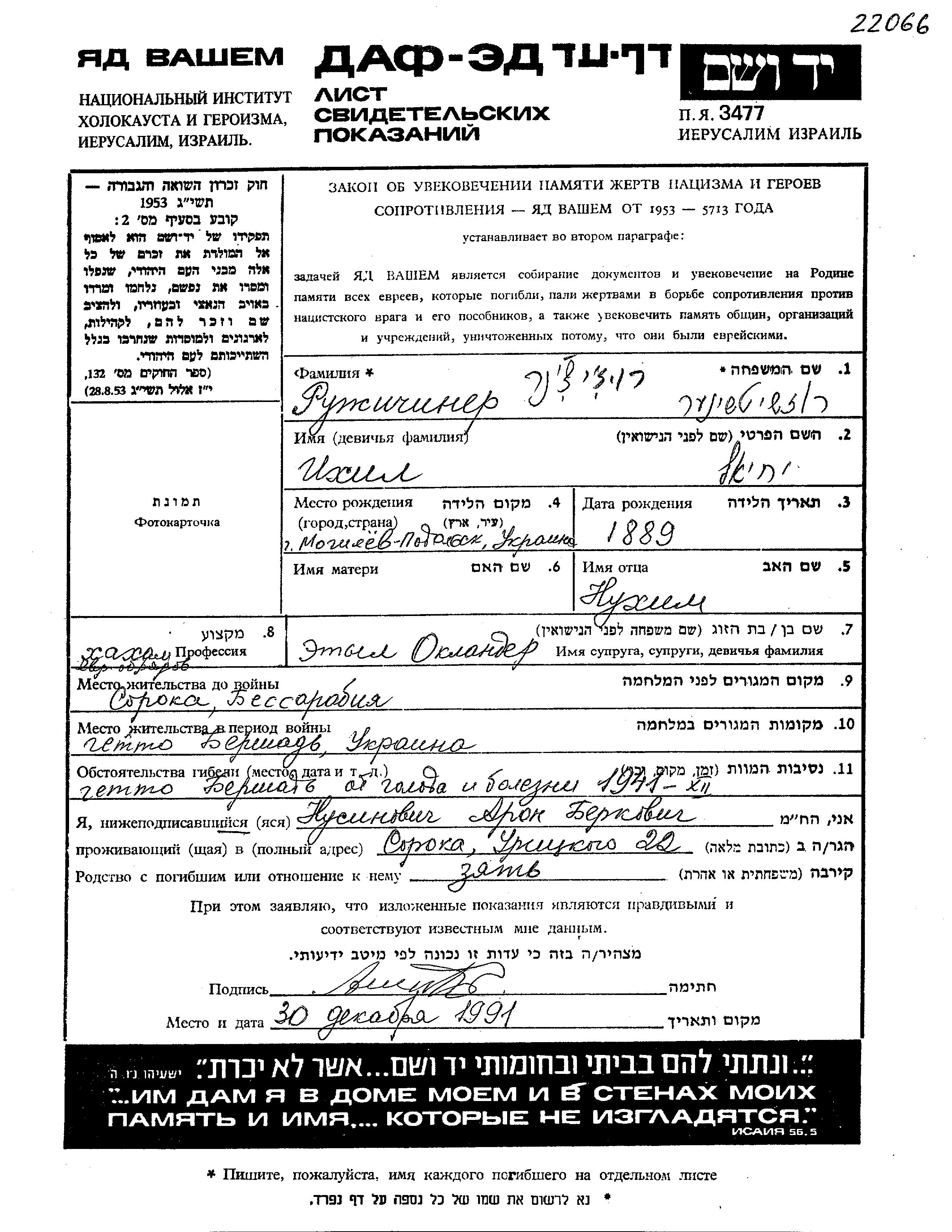 Ruzhichiner Ikhil 1889 Soroca, Rumania Hoja de Testimonio
