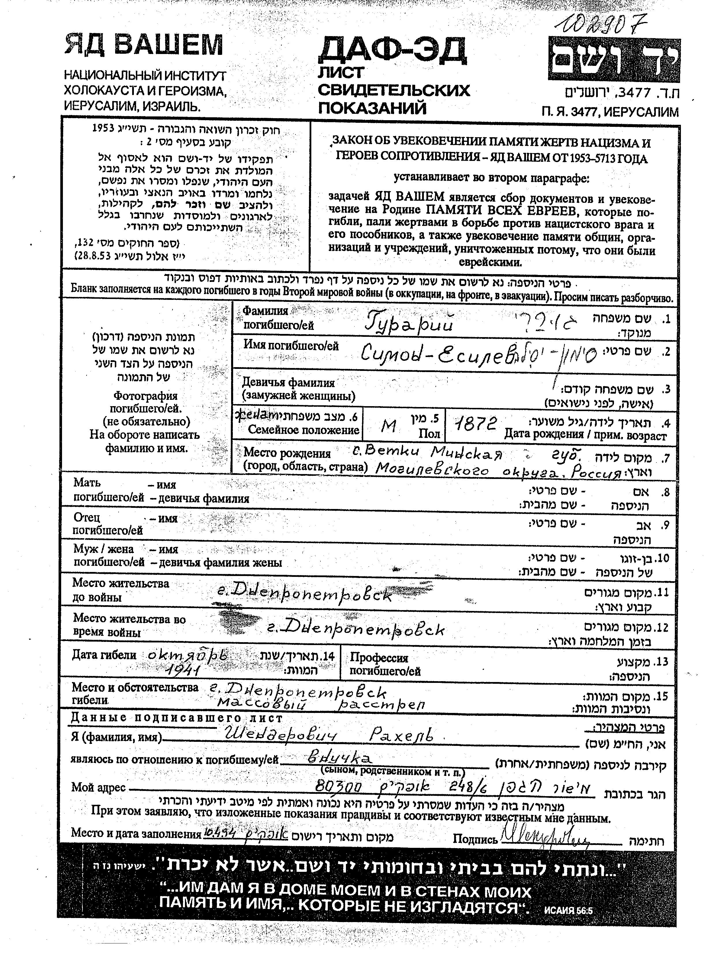 Gurari Simon 1872 Dnepropetrovsk, Ucrania (URSS) Hoja de Testimonio