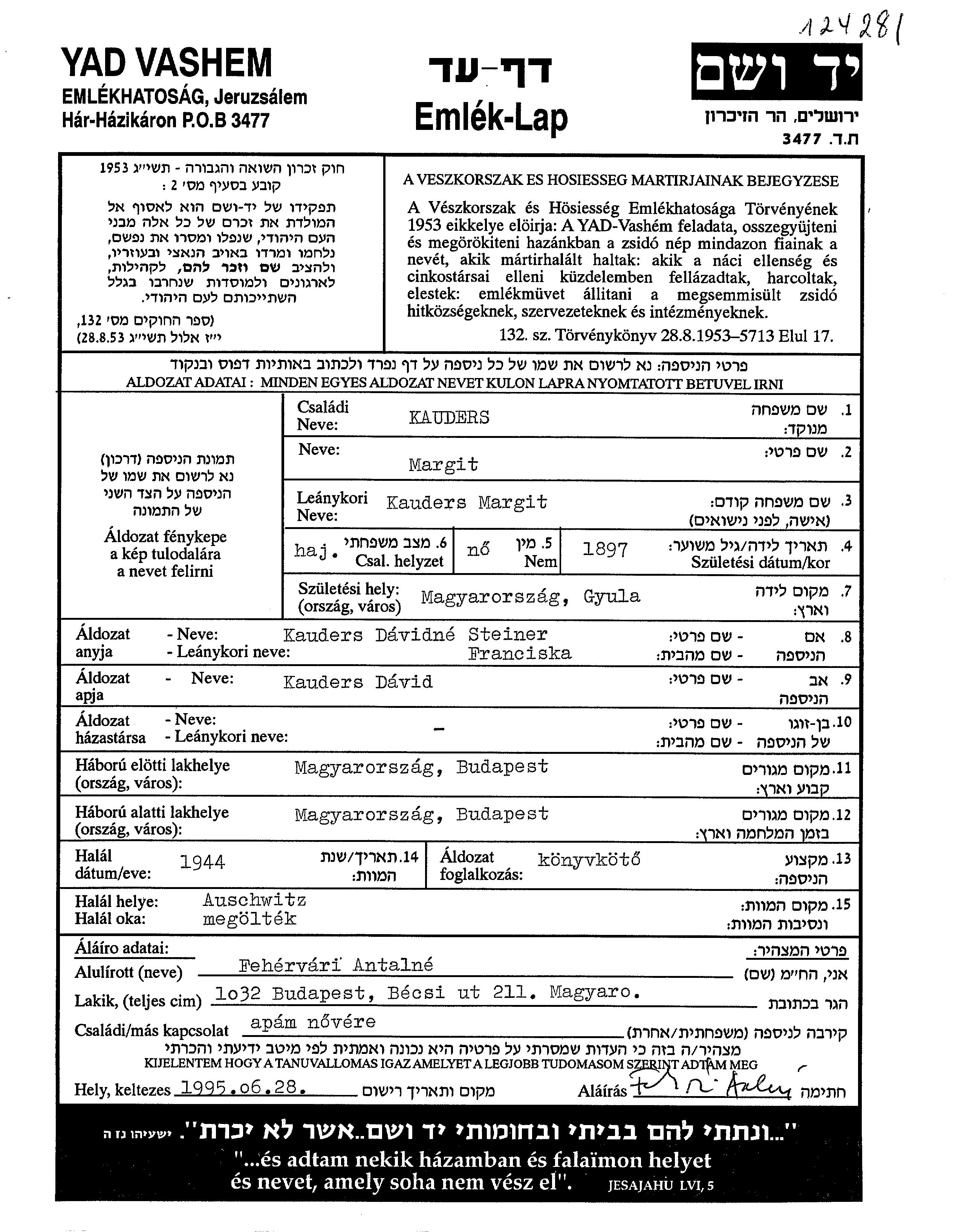 Kauders Margit 1897 Gyula, Hungría Hoja de Testimonio