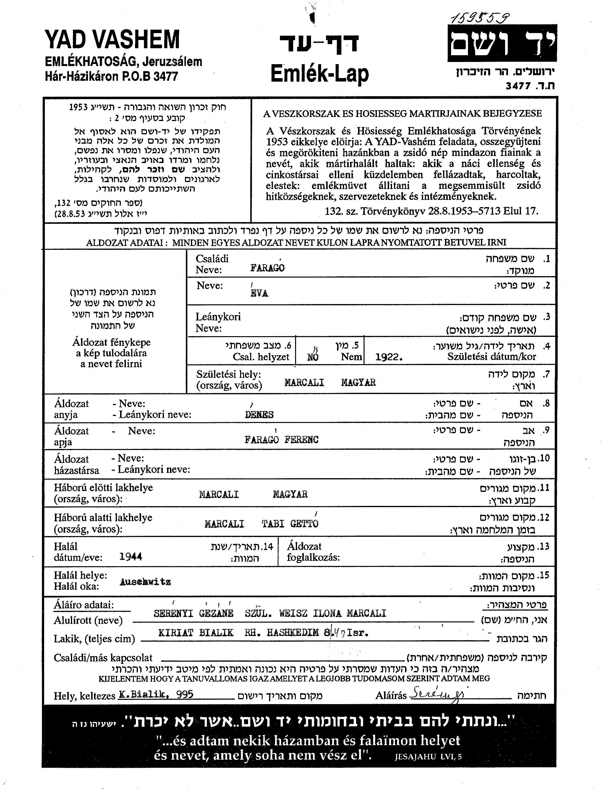 Farago Eva 1922 Marcali, Hungría Hoja de Testimonio