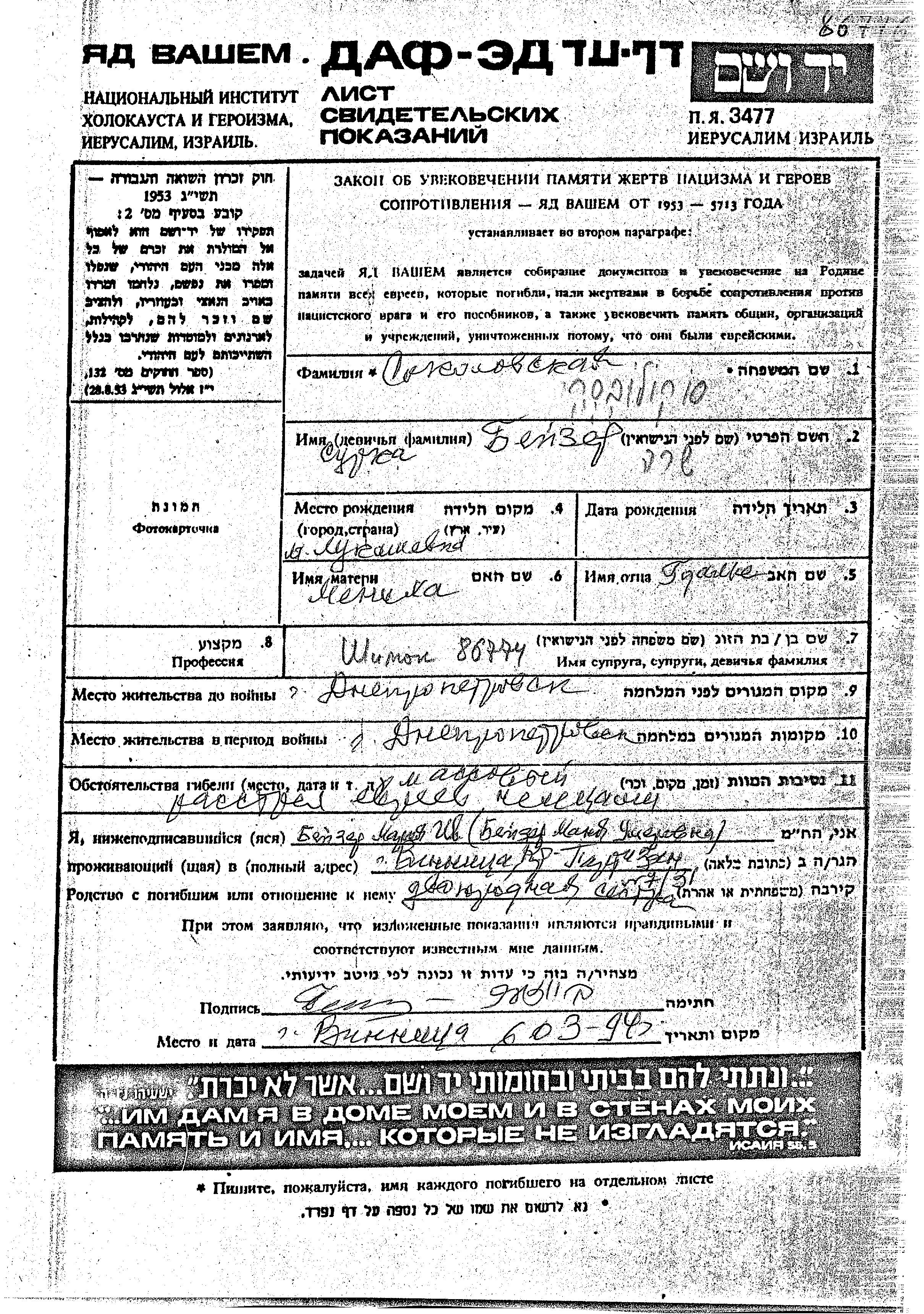 Surka Sokolovski apellido de soltera Beizer nació en Lukashovka, Ucrania (URSS), hija de Gdalye y Menukha. Era casada con Shimon. Antes de la segunda guerra mundial vivía en Dnepropetrovsk, Ucrania (URSS). Durante la guerra estuvo en Dnepropetrovsk, Ucrania (URSS).
