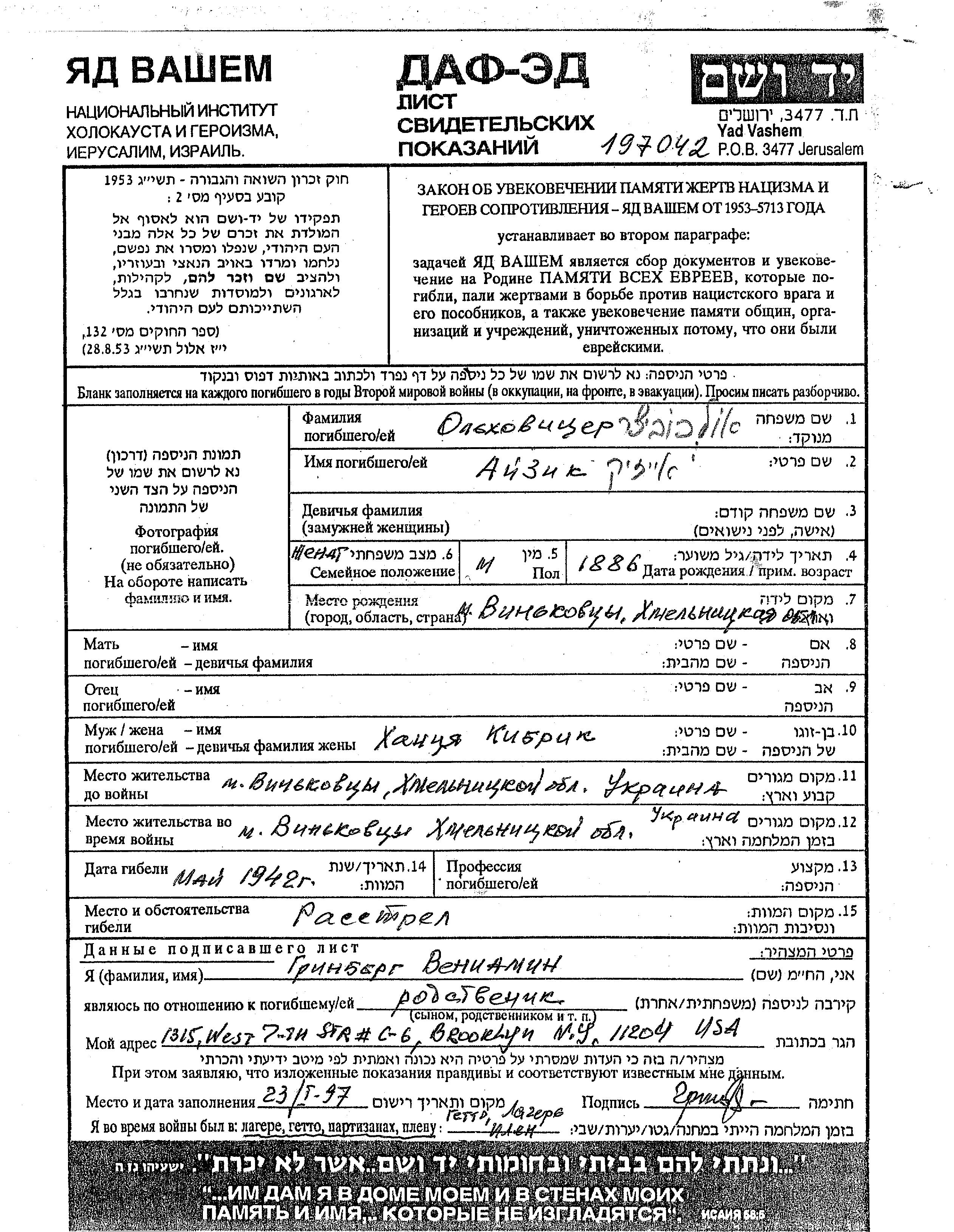Olkhovitzer Aizik 1886 Vinkovtsy, Ucrania (URSS) Hoja de Testimonio