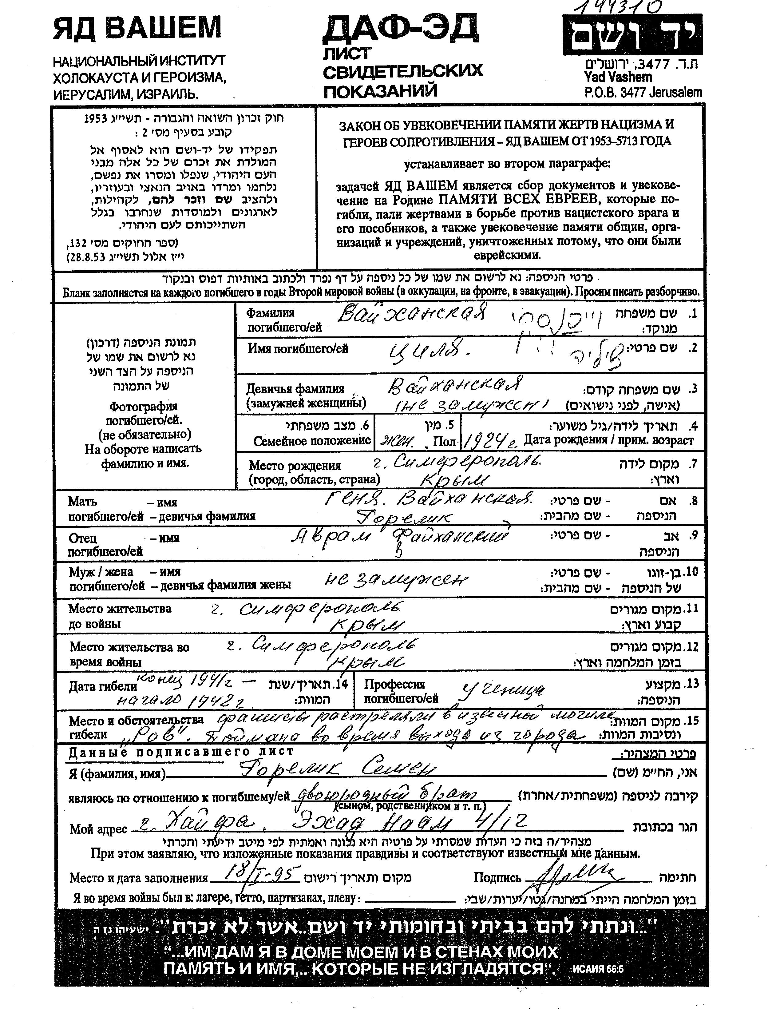 Vaikhanski Tzilia 1924 Simferopol, Rusia (URSS) Hoja de Testimonio