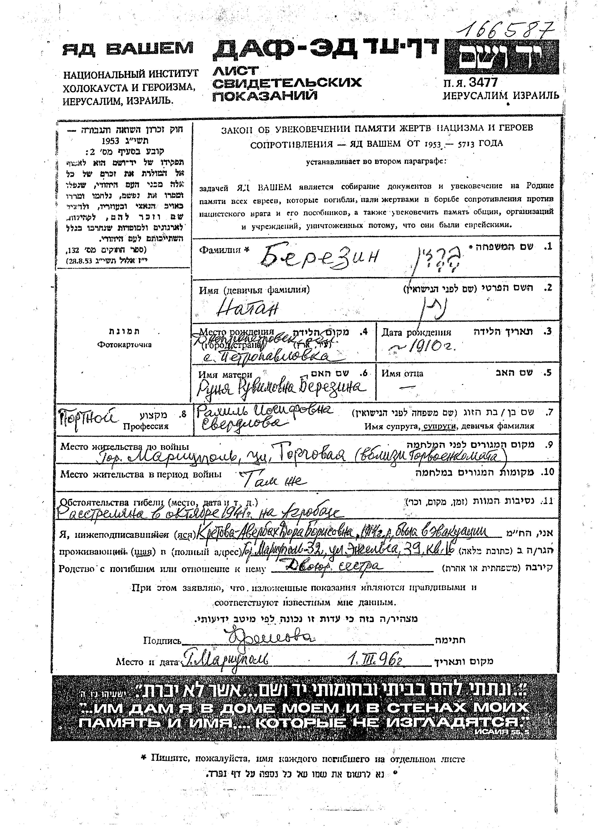 Berezin Natan 1910 Mariupol, Ucrania (URSS) Hoja de Testimonio